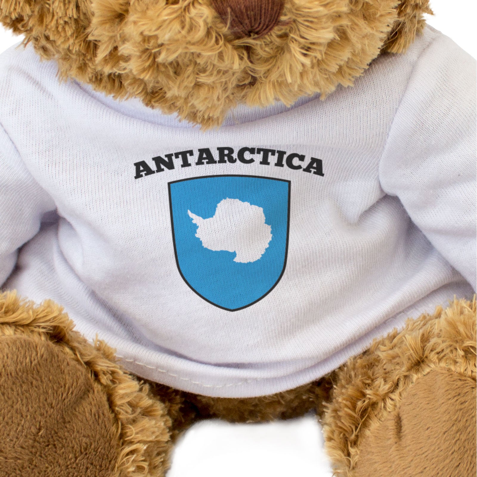 Our bear wears a white t-shirt with the flag of Antarctica printed on it in full colour. This bear makes a thoughtful and personal gift for friends and family.