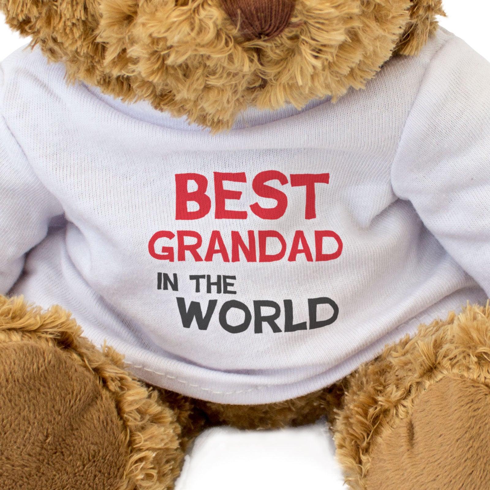 This cute teddy bear wears a white t-shirt with Best Grandad in the World printed on it.