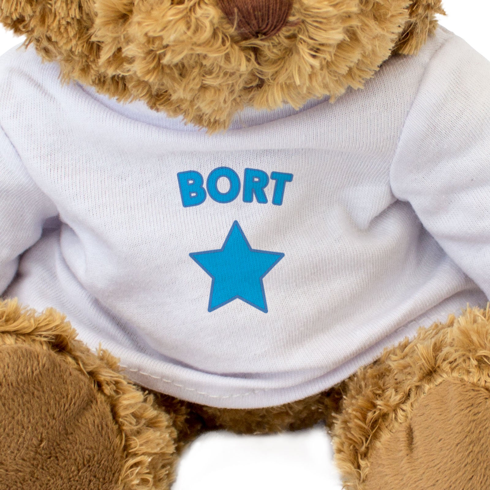 Our bear wears a white t-shirt with Bort printed on it in blue. This bear makes a thoughtful and personal gift for family members and friends