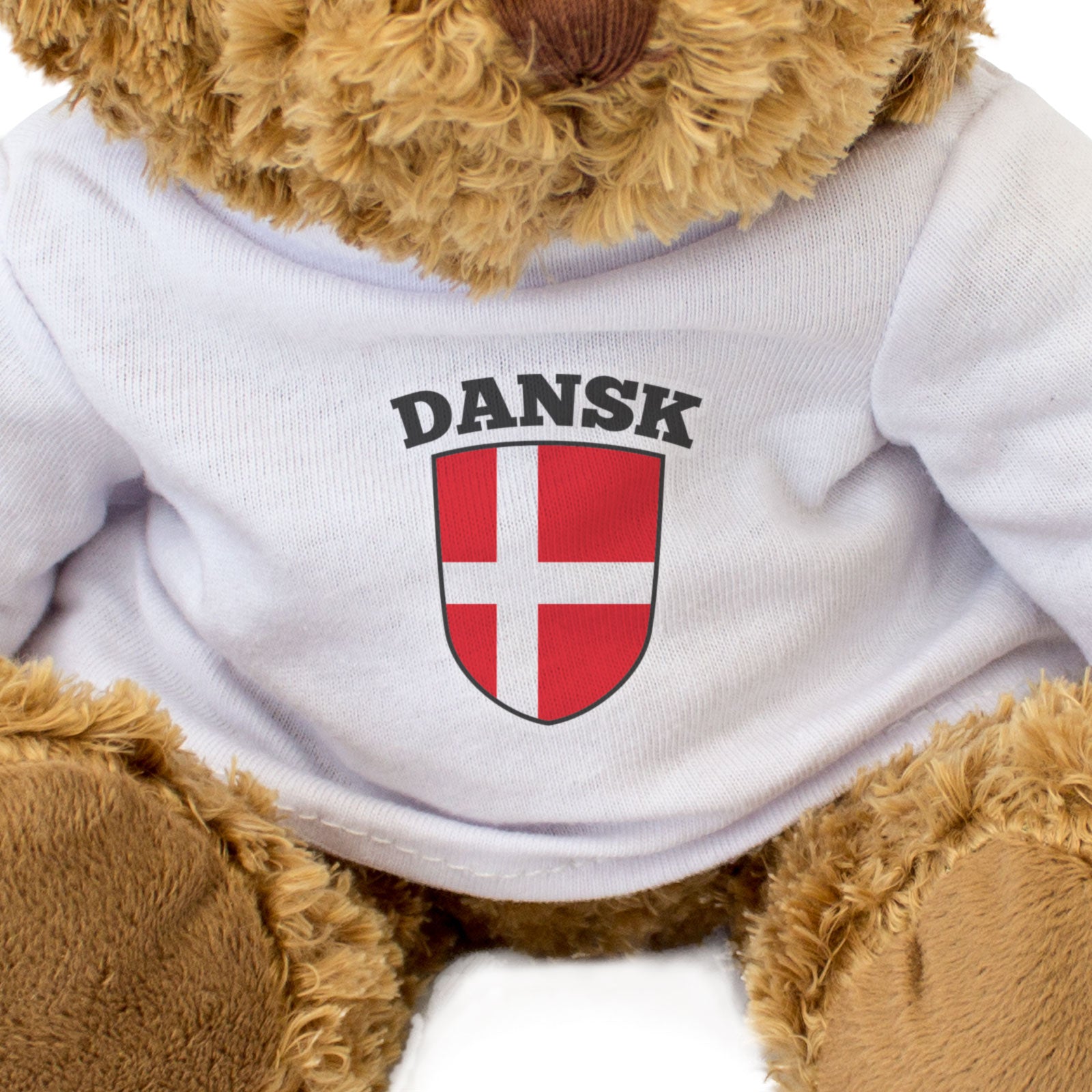 This cute teddy bear wears a white t-shirt with the Dansk Flag printed on it.