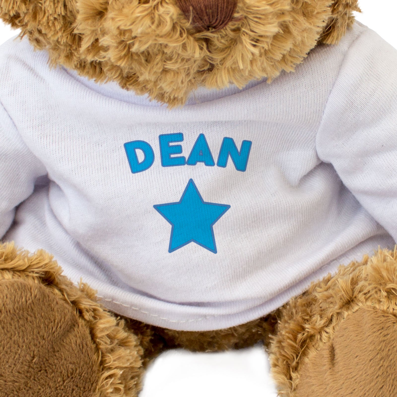 Our bear wears a white t-shirt with Dean printed on it in blue. This bear makes a thoughtful and personal gift for family members and friends