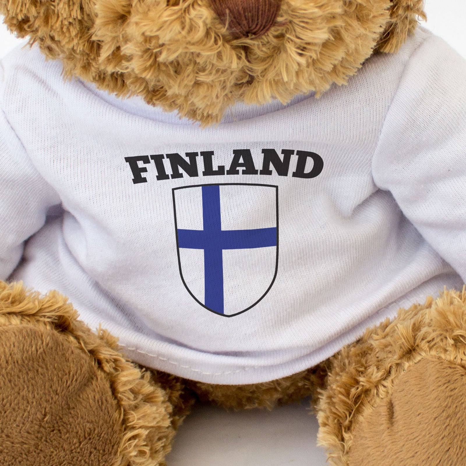 Our bear wears a white t-shirt with the Finland Flag printed on it in full colour. This teddy bear makes a thoughtful and personal gift for friends and family.