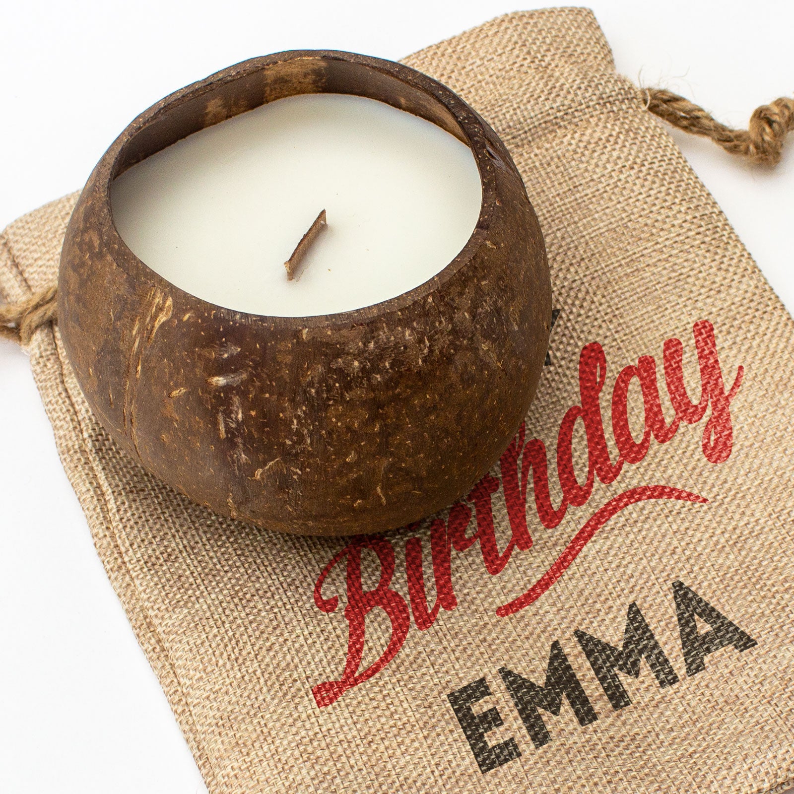 This luxury candle comes with the name - HAPPY BIRTHDAY EMMA on the draw-string bag.