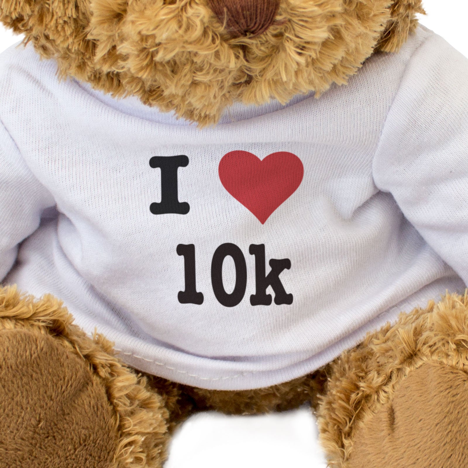 Our bear wears a white t-shirt with I Love 10k printed on it in full colour. This teddy bear makes a thoughtful and personal gift for friends and family.