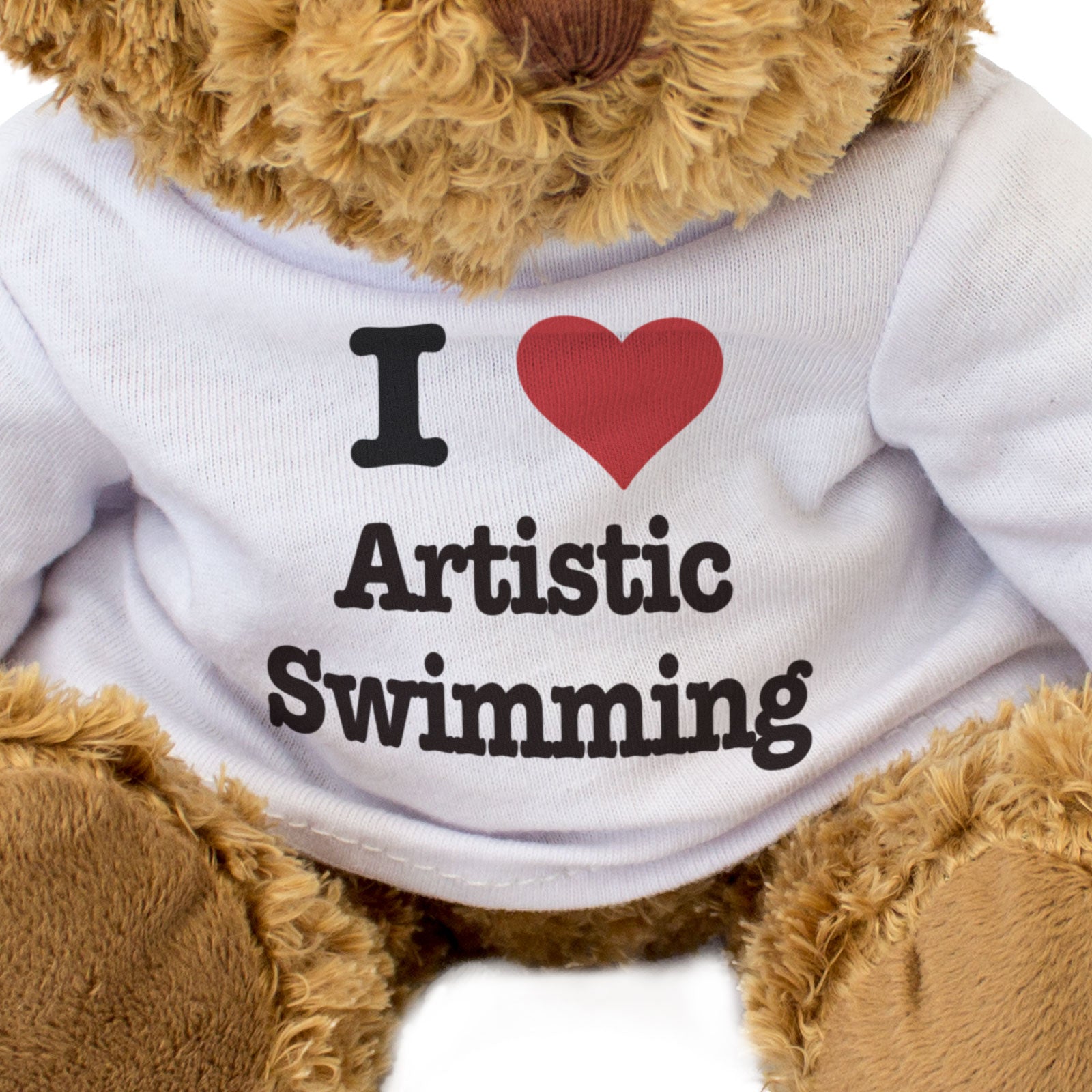 Our bear wears a white t-shirt with I Love Artistic Swimming printed on it in full colour. This teddy bear makes a thoughtful and personal gift for friends and family.