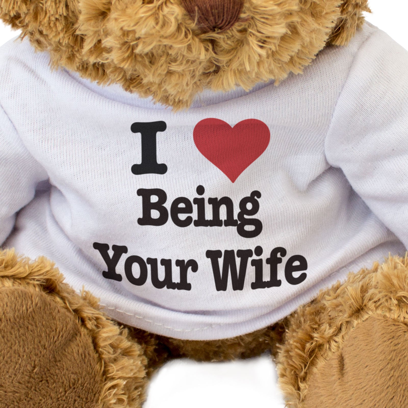 Our bear wears a white t-shirt with I Love Being Your Wife printed on it in full colour. This teddy bear makes a thoughtful and personal gift for friends and family.