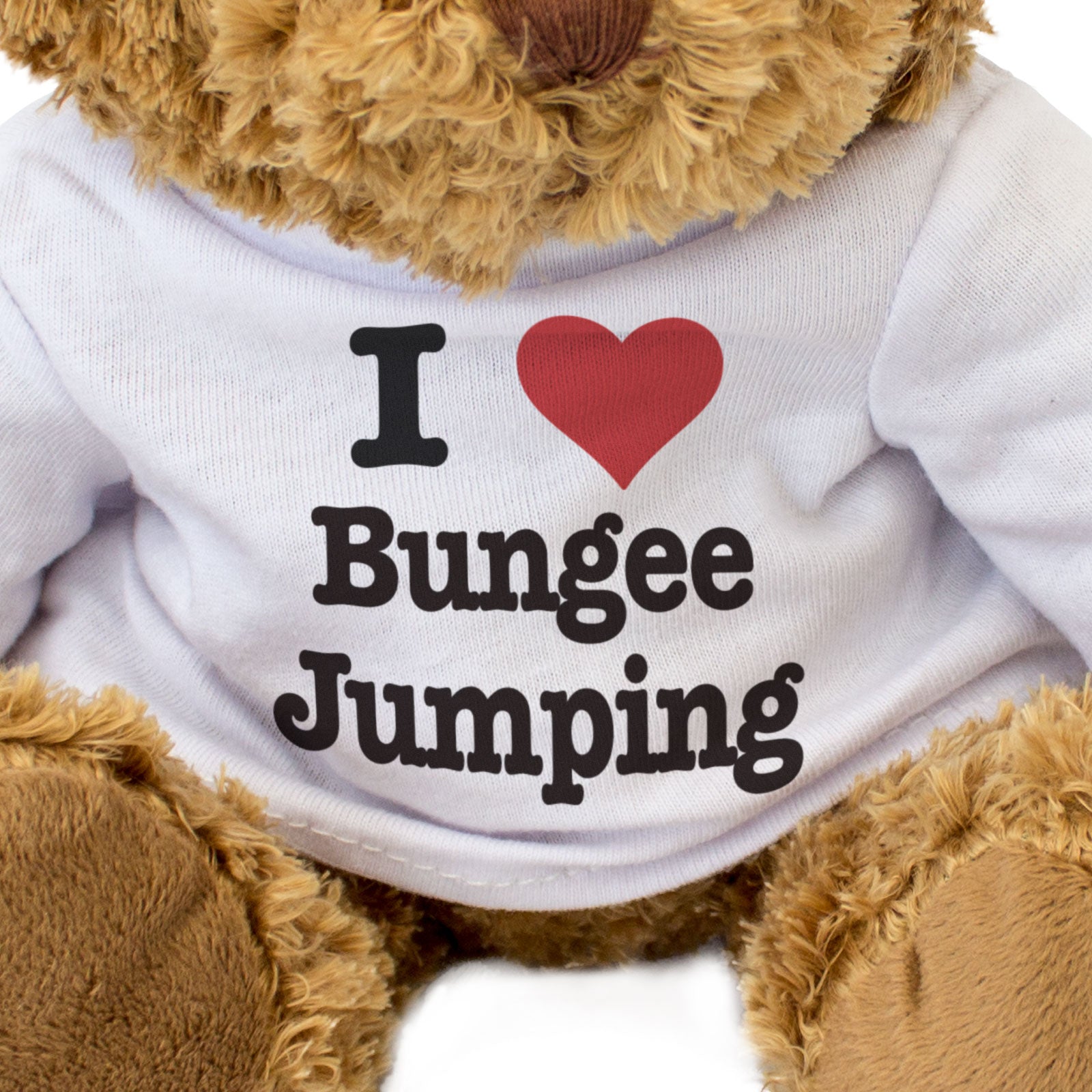 Our bear wears a white t-shirt with I Love Bungee Jumping printed on it in full colour. This teddy bear makes a thoughtful and personal gift for friends and family.