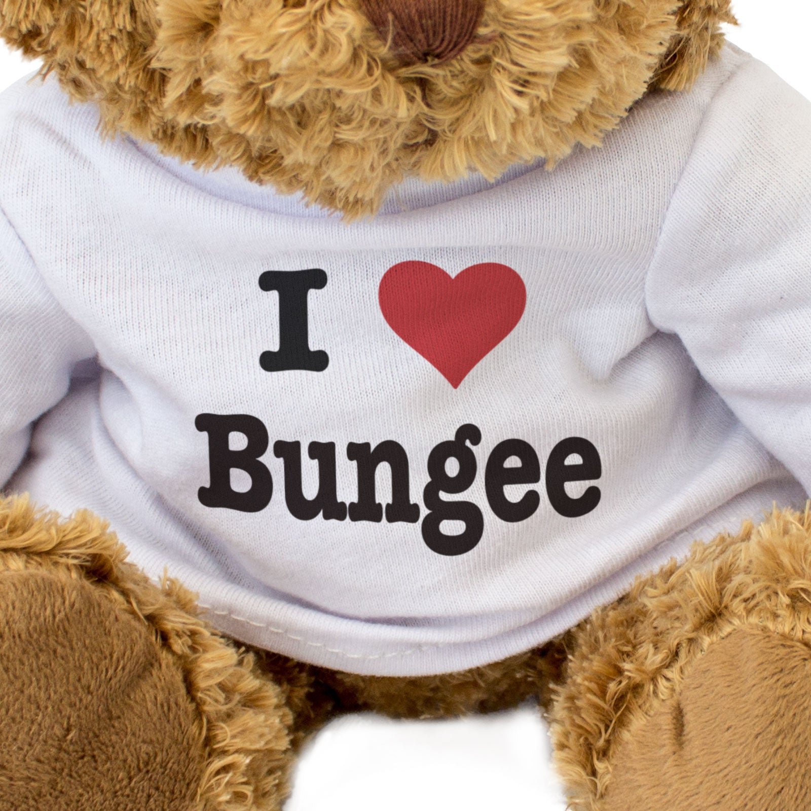 Our bear wears a white t-shirt with I Love Bungee printed on it in full colour. This teddy bear makes a thoughtful and personal gift for friends and family.