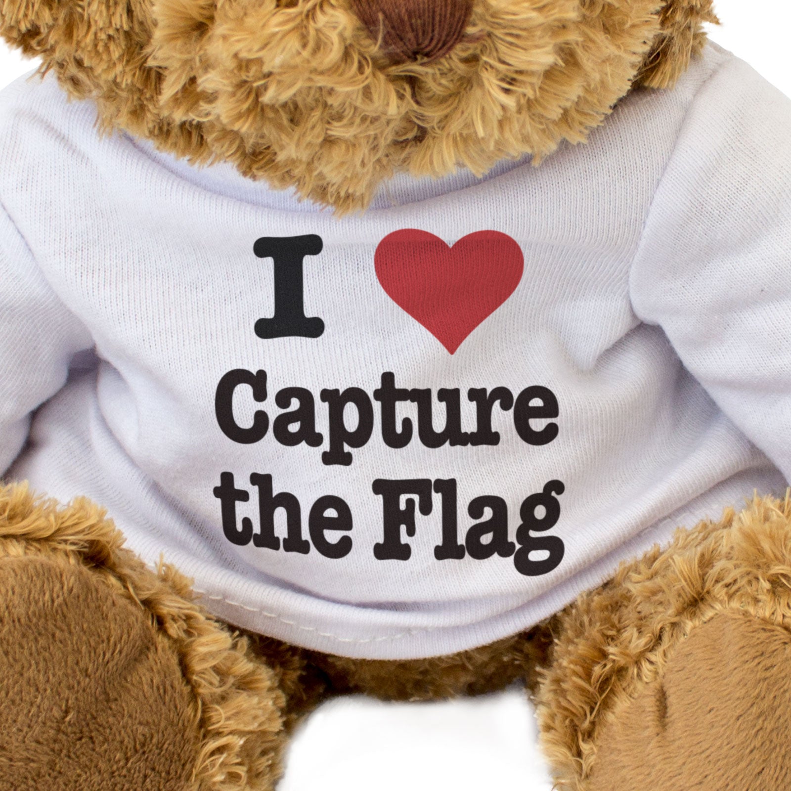 Our bear wears a white t-shirt with I Love Capture the Flag printed on it in full colour. This teddy bear makes a thoughtful and personal gift for friends and family.