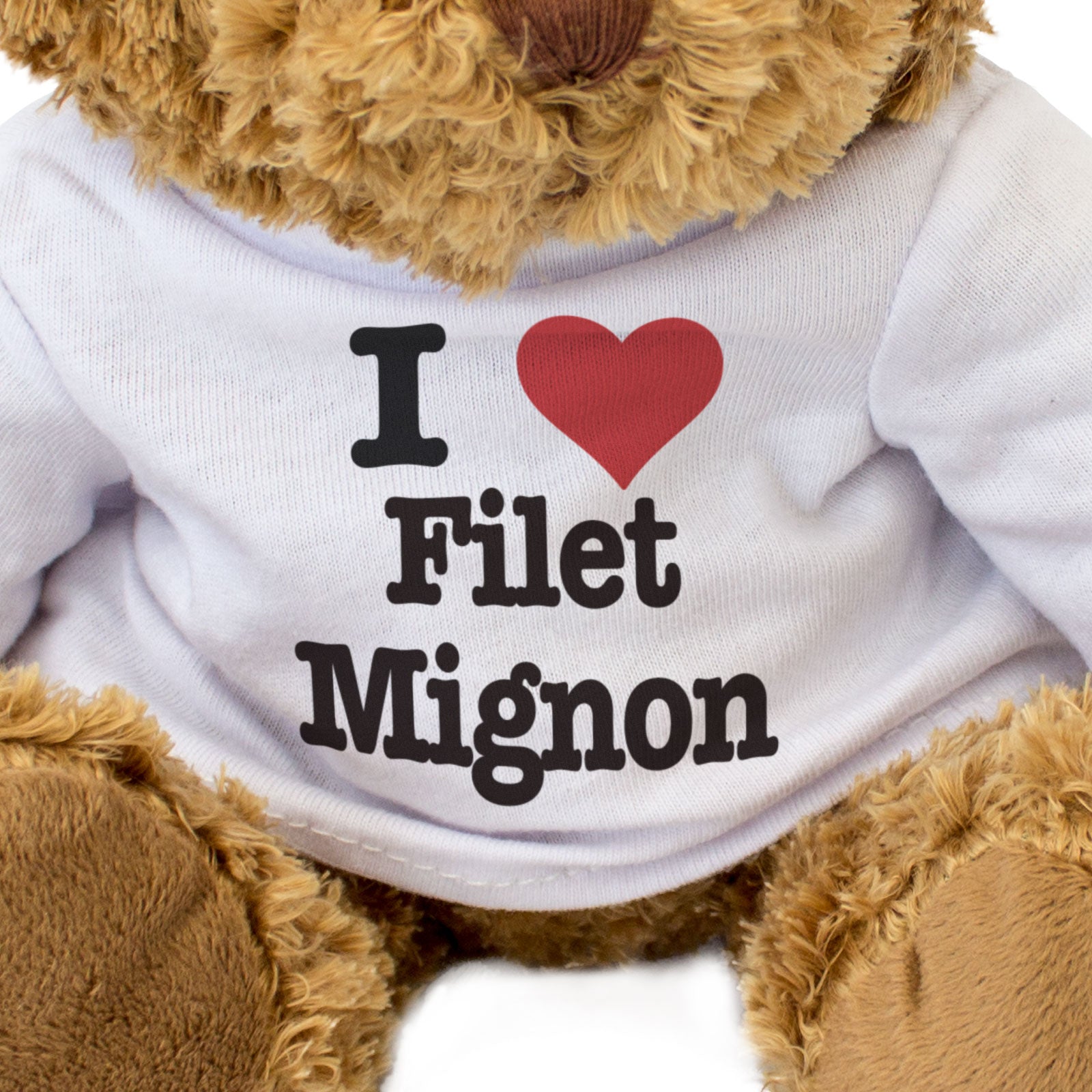 Our bear wears a white t-shirt with I Love Filet Mignon printed on it in full colour. This teddy bear makes a thoughtful and personal gift for friends and family.