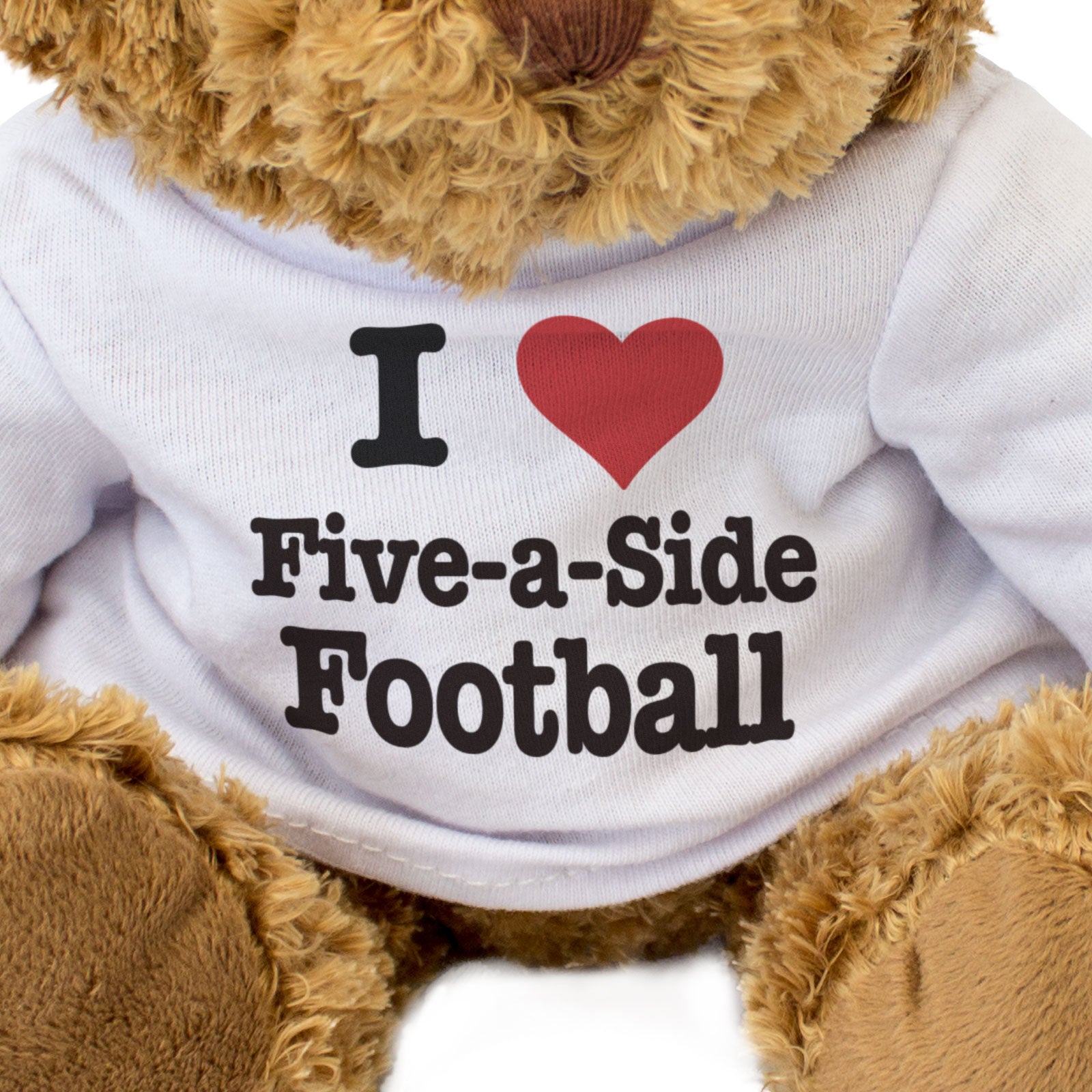 Our bear wears a white t-shirt with I Love Five-A-Side Football printed on it in full colour. This teddy bear makes a thoughtful and personal gift for friends and family.