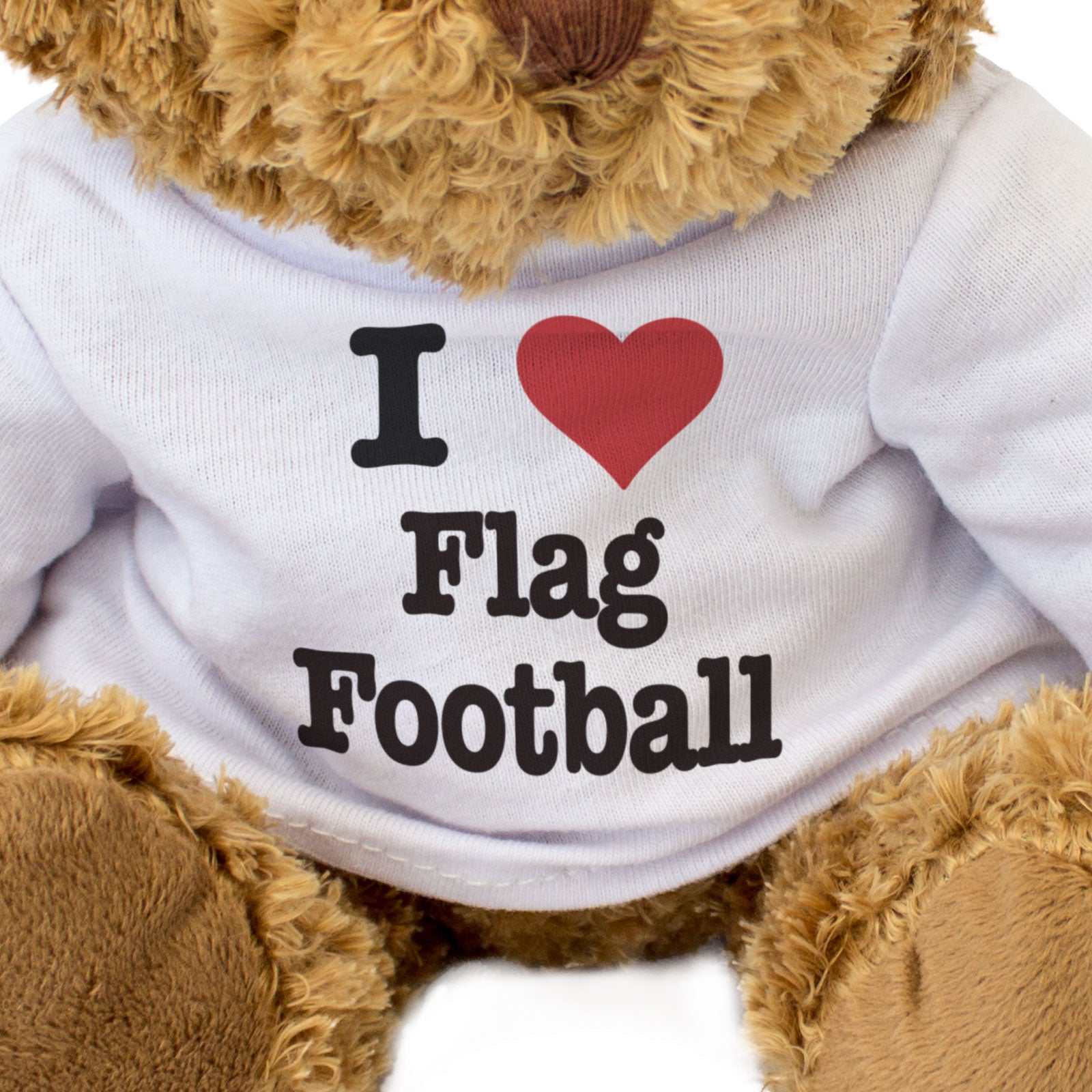Our bear wears a white t-shirt with I Love Flag Football printed on it in full colour. This teddy bear makes a thoughtful and personal gift for friends and family.