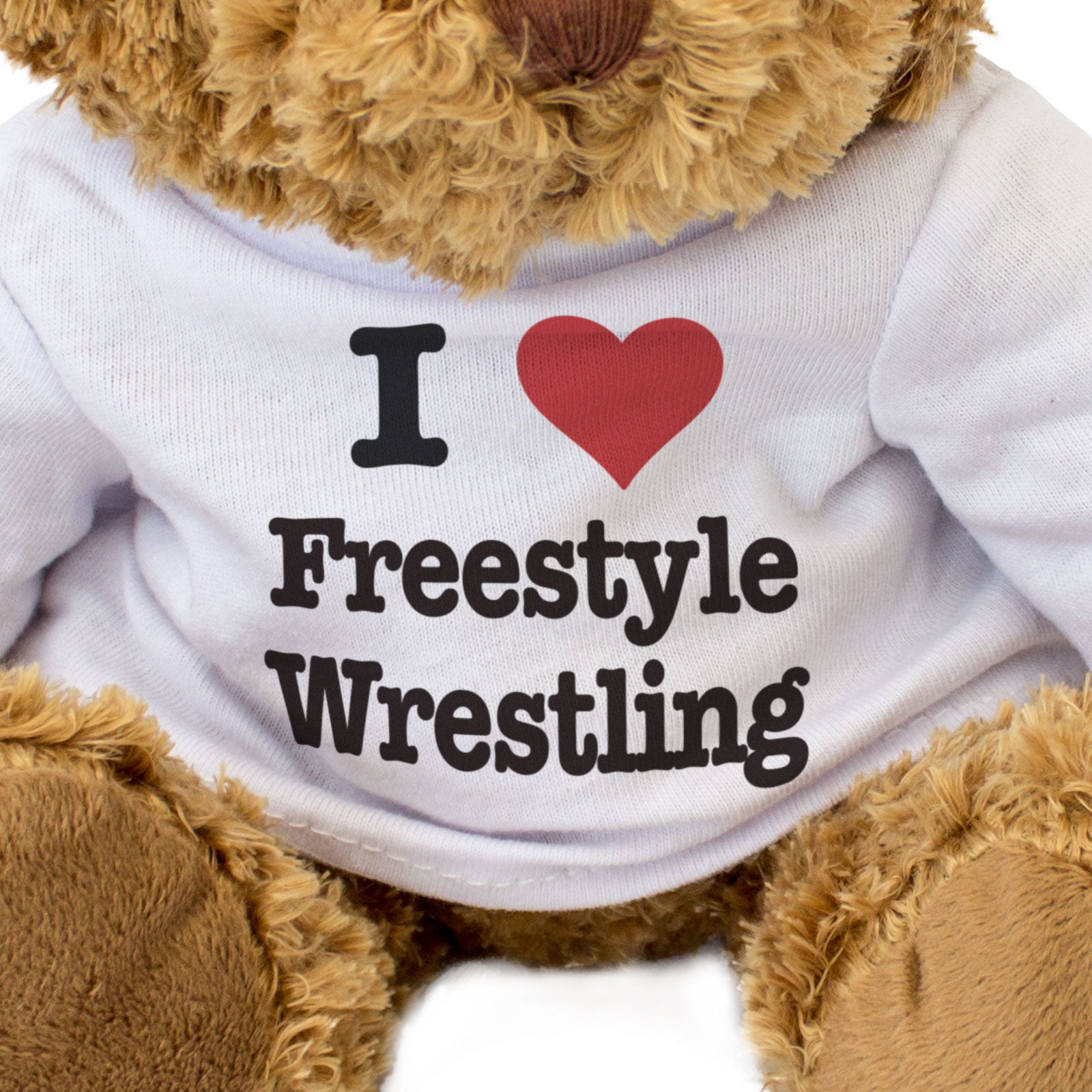 Our bear wears a white t-shirt with I Love Freestyle Wrestling printed on it in full colour. This teddy bear makes a thoughtful and personal gift for friends and family.