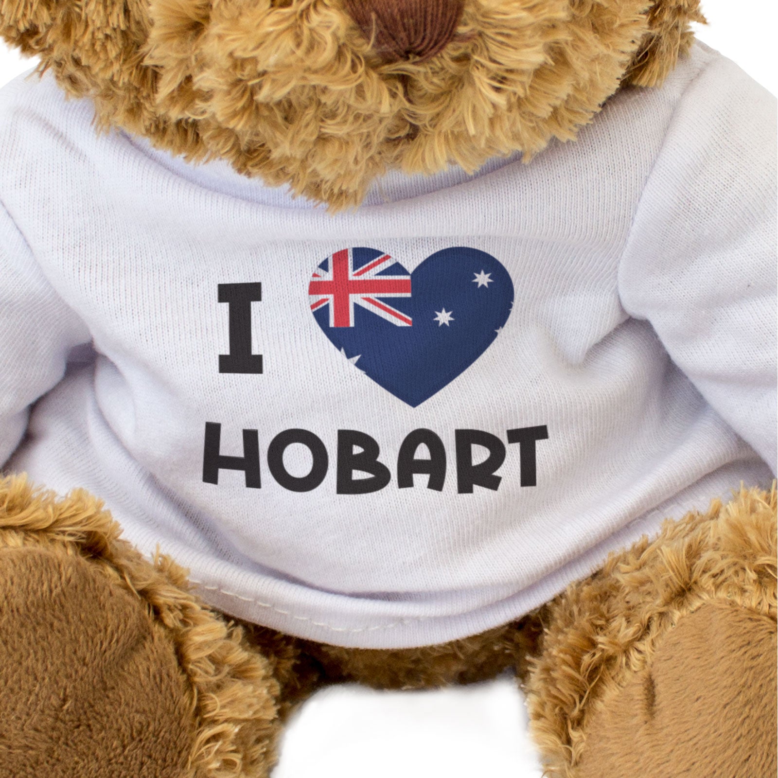 Our bear wears a white t-shirt with I Love Hobart printed on it in full colour. This teddy bear makes a thoughtful and personal gift for friends and family.