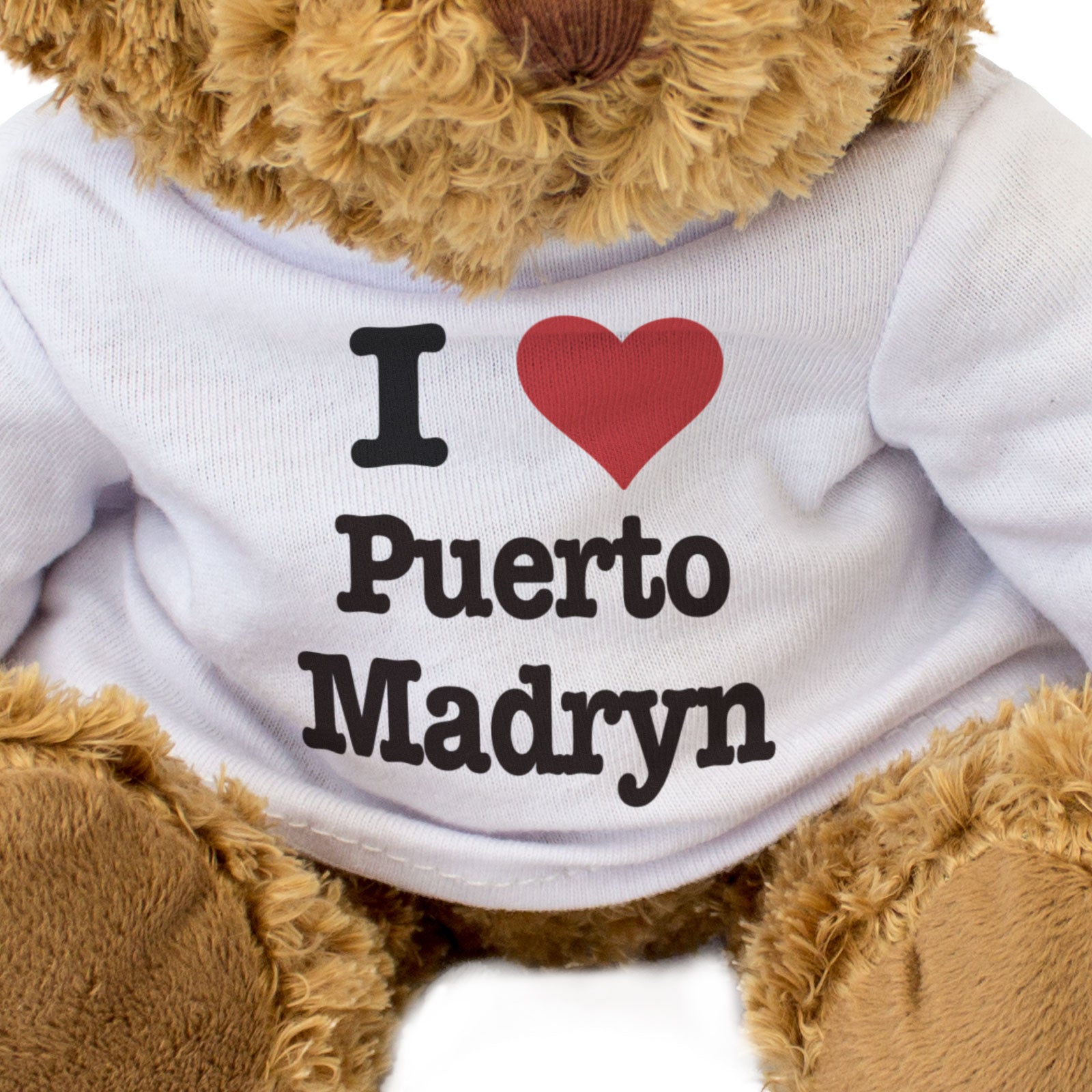 Our bear wears a white t-shirt with I Love Puerto Madryn printed on it in full colour. This teddy bear makes a thoughtful and personal gift for friends and family.