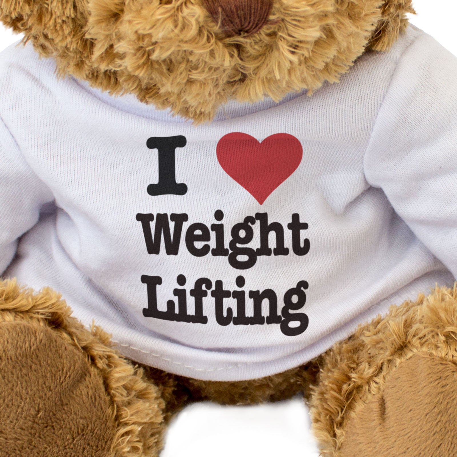Our bear wears a white t-shirt with the I Love Weight Lifting printed on it in full colour. This teddy bear makes a thoughtful and personal gift for friends and family.