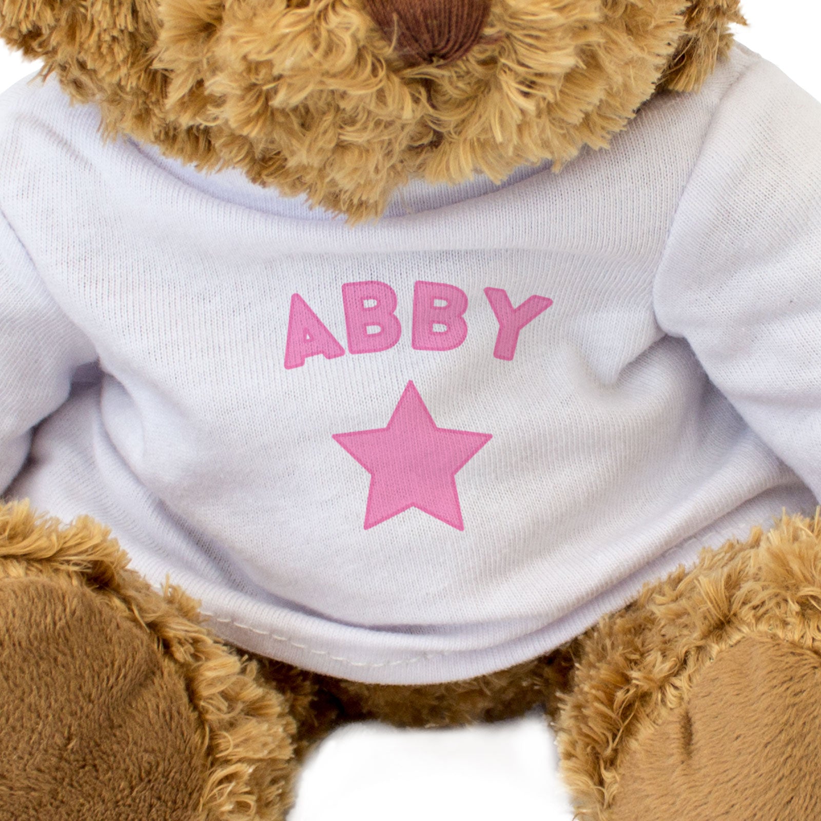 Our bear wears a white t-shirt with Abby printed on it in pink. This teddy bear makes a thoughtful and personal gift for family members and friends