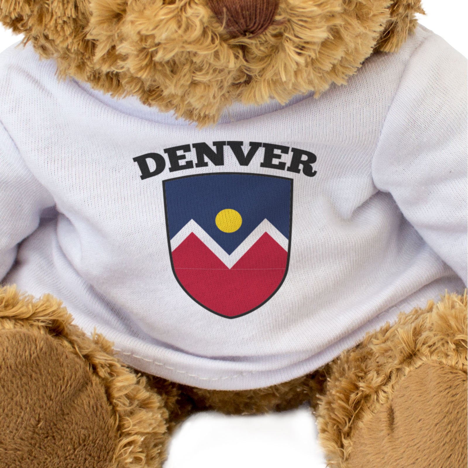 Our bear wears a white t-shirt with the flag of Denver printed on it in full colour. This bear makes a thoughtful and personal gift for friends and family.