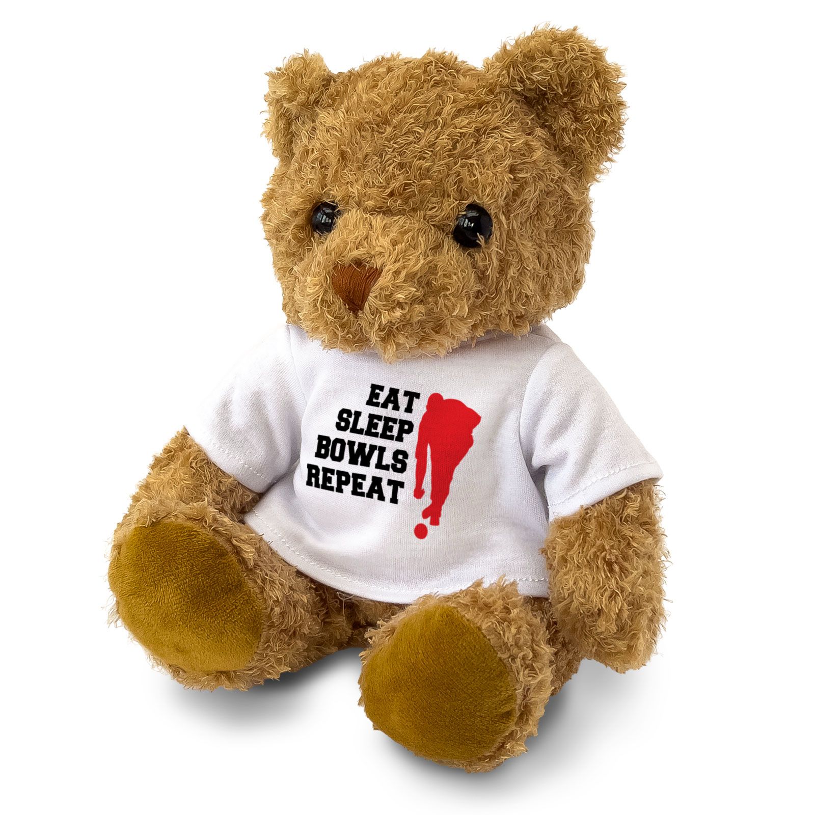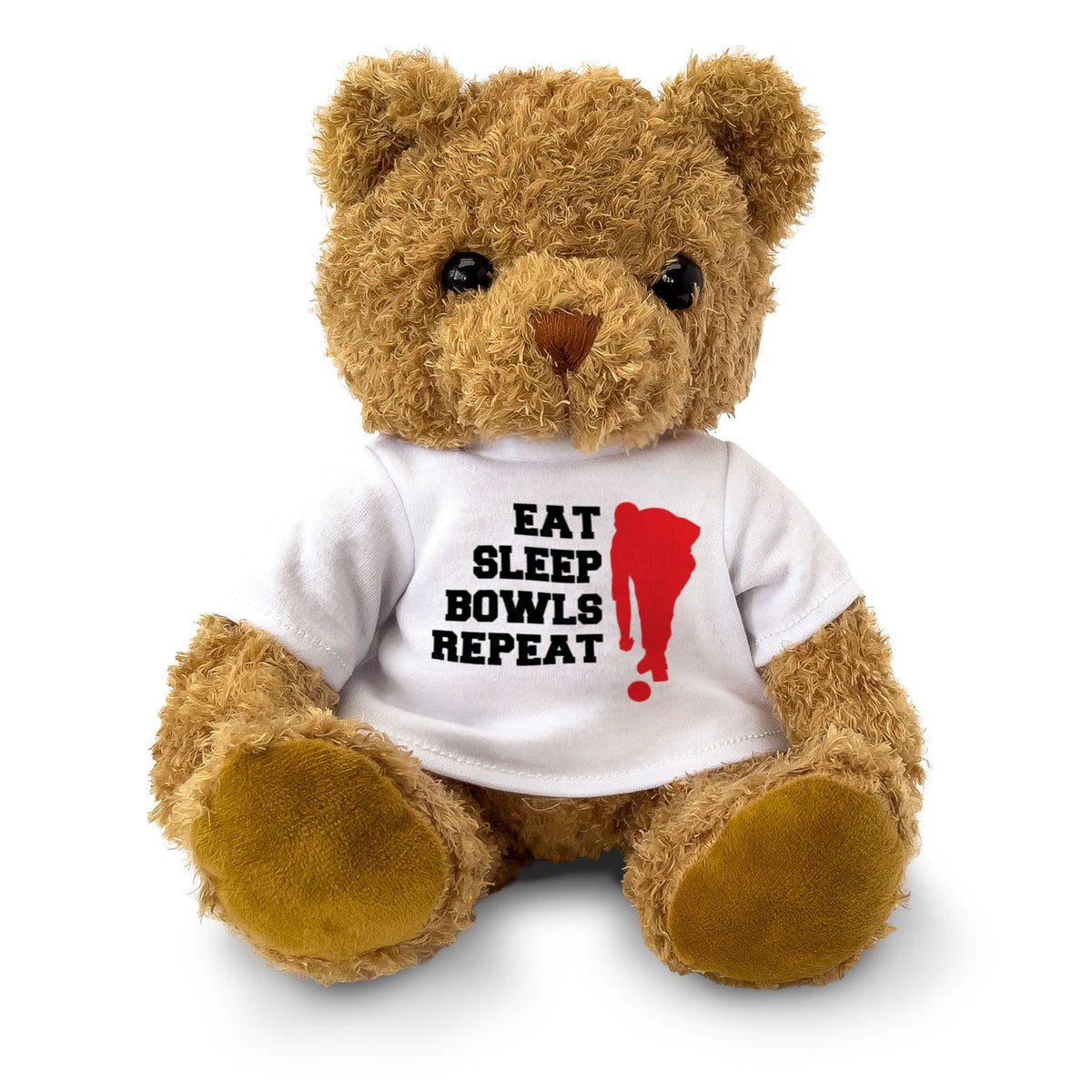 Our bear wears a white t-shirt with Eat Sleep Bowls Repeat printed on it in full colour. This teddy bear makes a thoughtful and personal gift for friends and family.