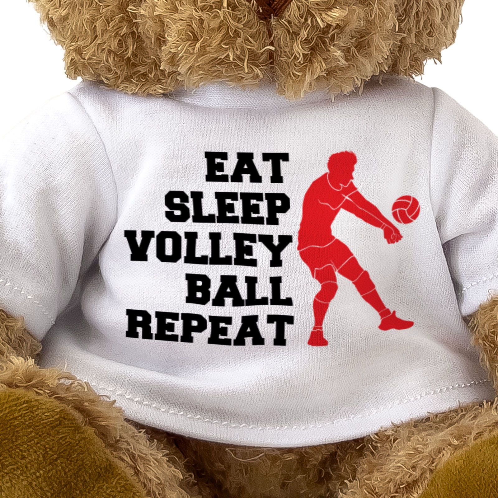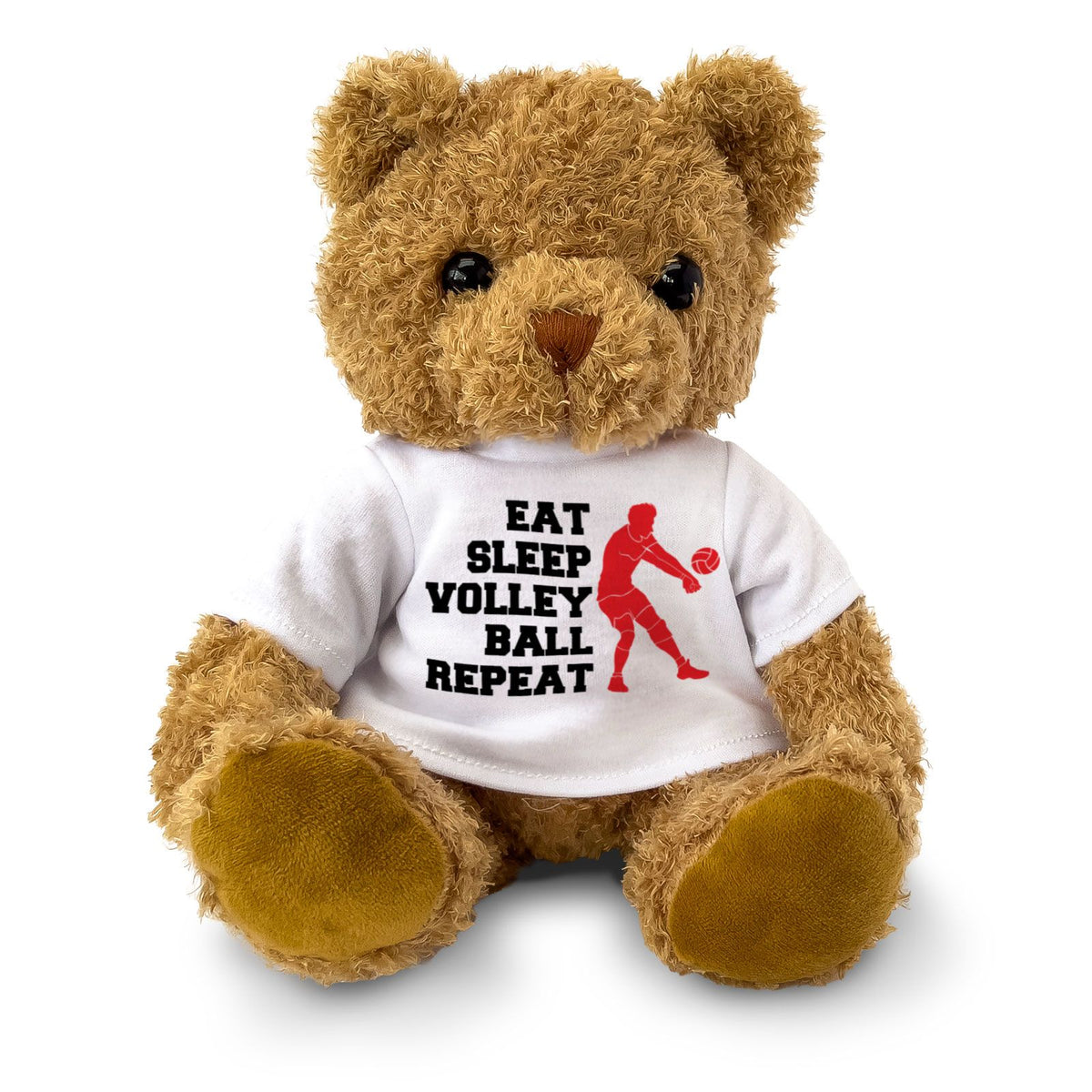 Our bear wears a white t-shirt with Eat Sleep Volleyball Repeat printed on it in full colour. This teddy bear makes a thoughtful and personal gift for friends and family.