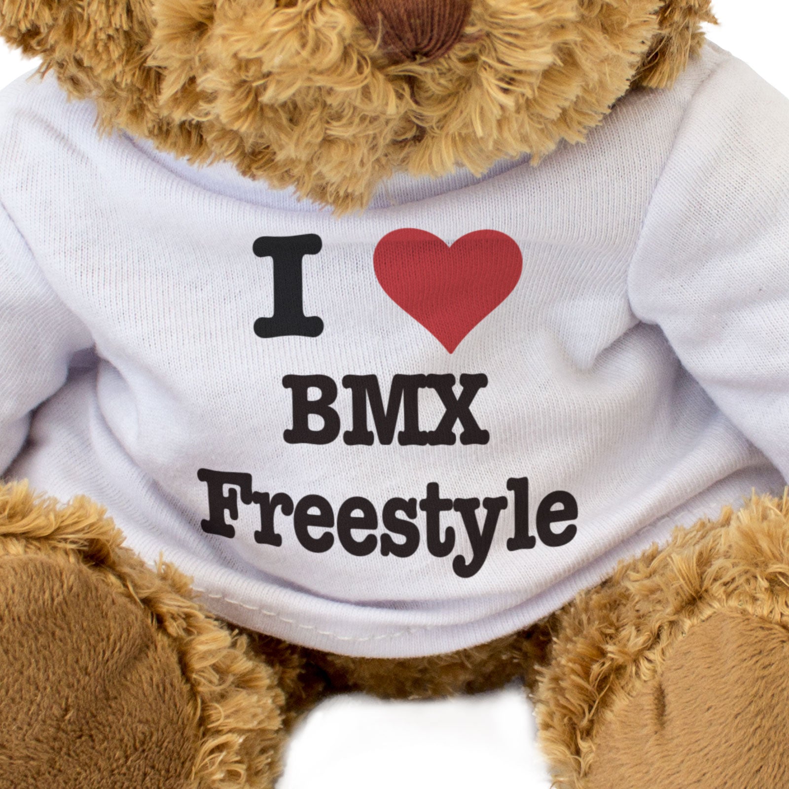 Our bear wears a white t-shirt with I Love BMX Freestyle printed on it in full colour. This teddy bear makes a thoughtful and personal gift for friends and family.