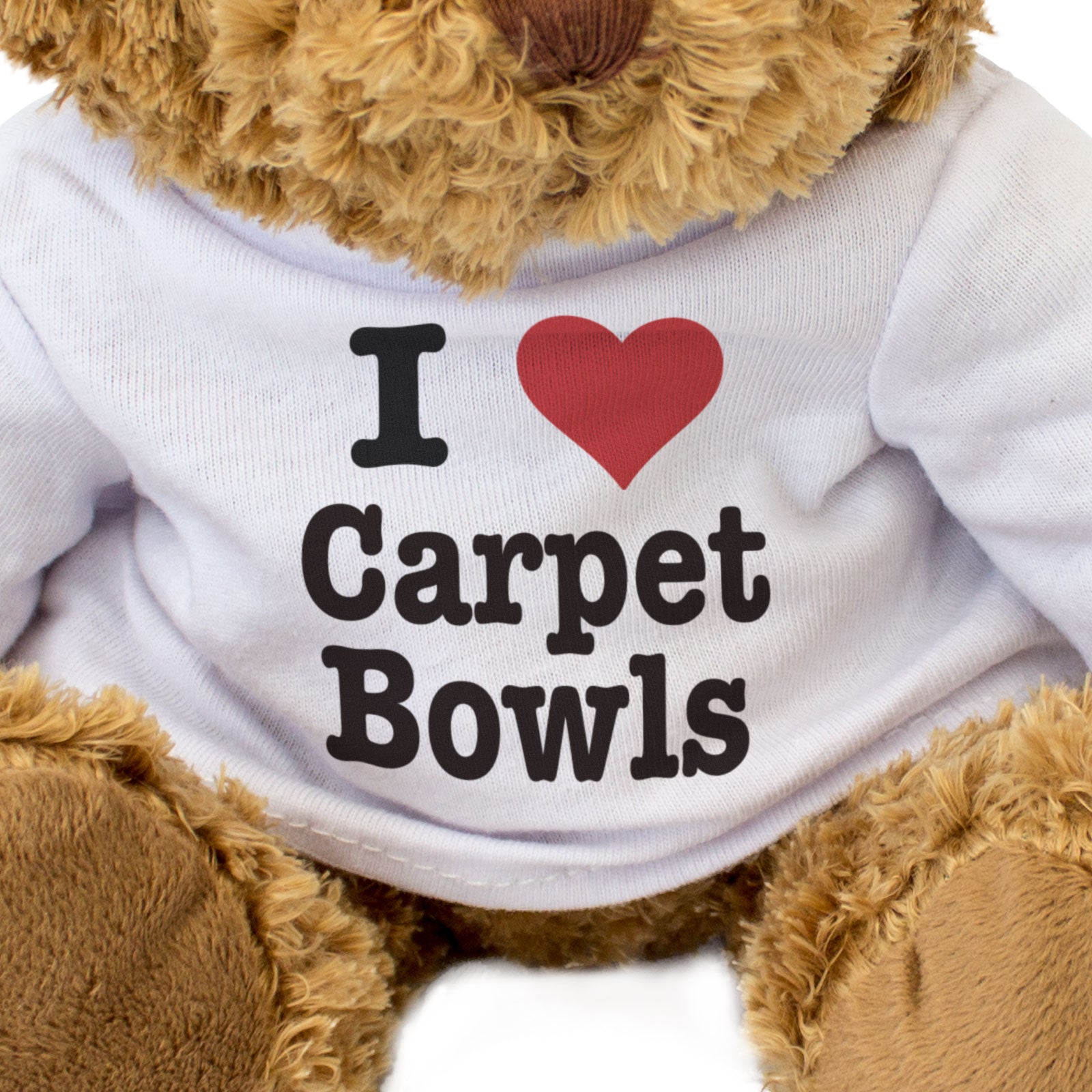 This teddy bear wears a white t-shirt with I LOVE CARPET BOWLS printed on it.
