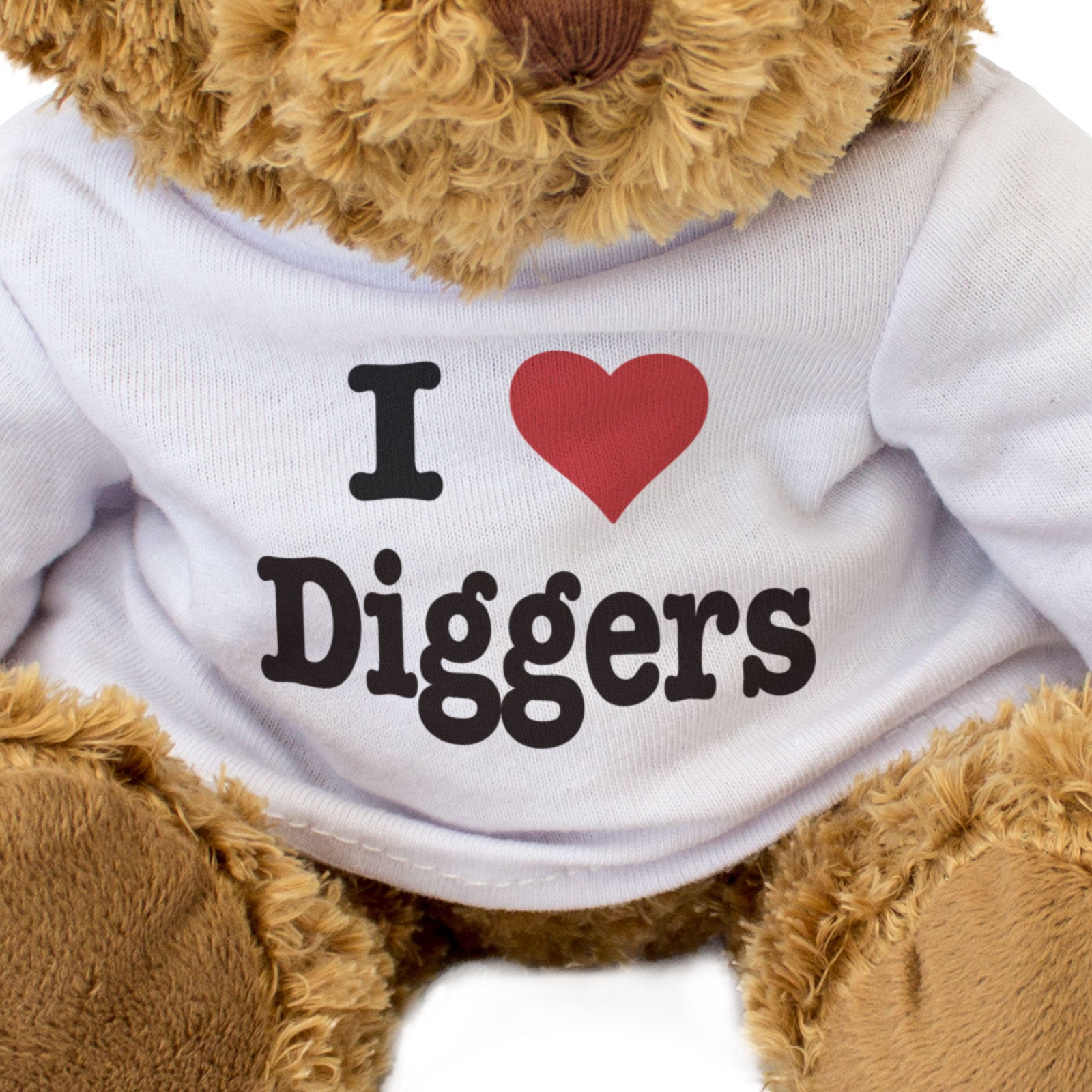 Our bear wears a white t-shirt with I Love Diggers printed on it in full colour. This teddy bear makes a thoughtful and personal gift for friends and family.