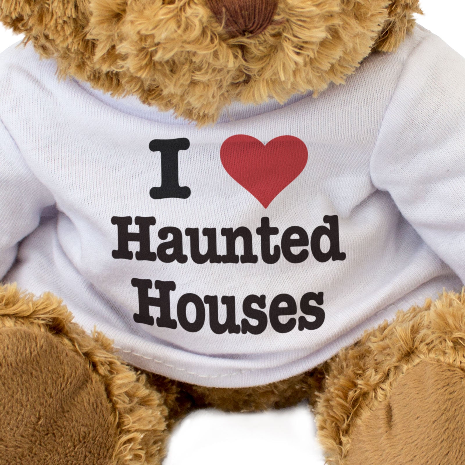 Our bear wears a white t-shirt with I Love Haunted Houses printed on it in full colour. This teddy bear makes a thoughtful and personal gift for friends and family.