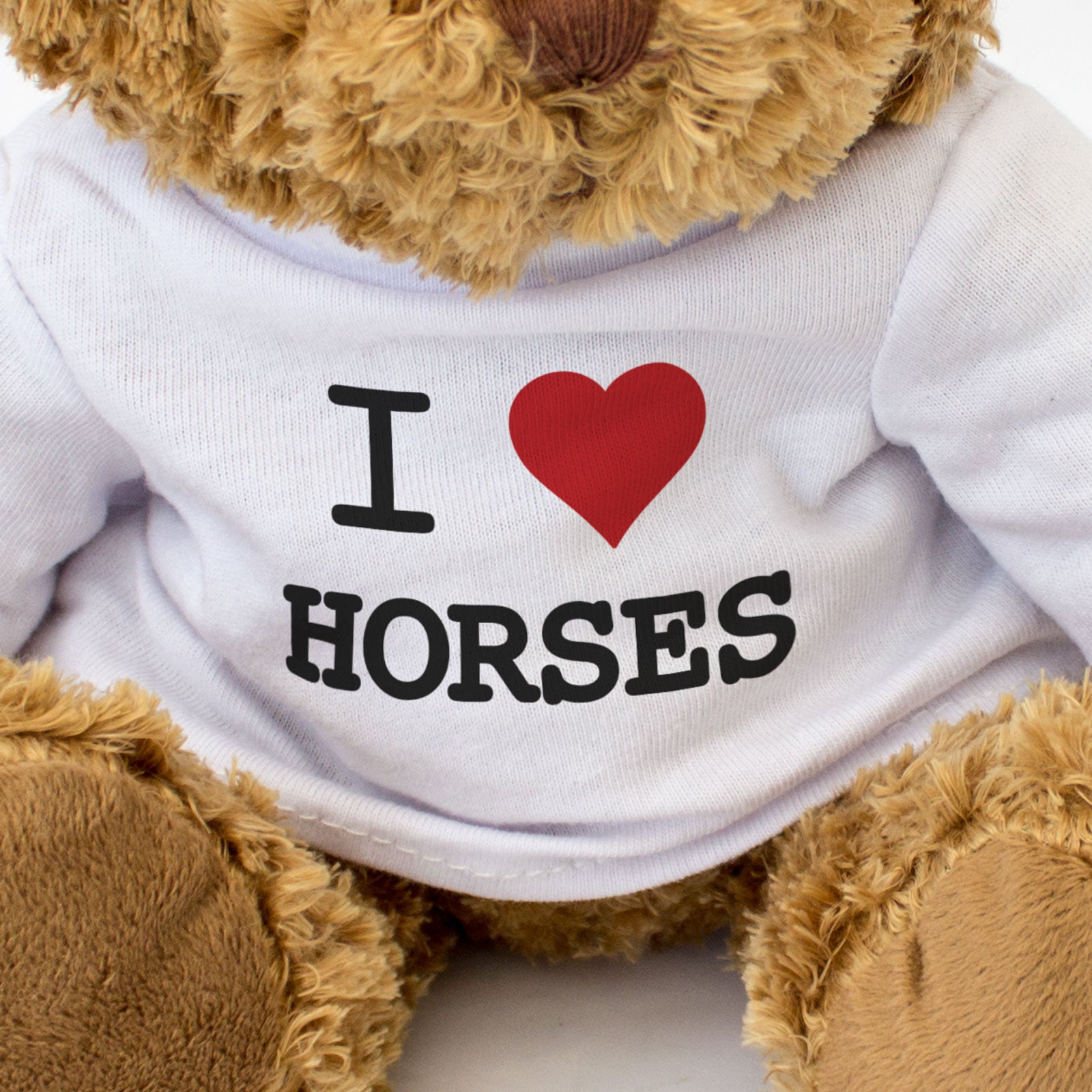 This teddy bear wears a white t-shirt with I Love Horses printed on it.