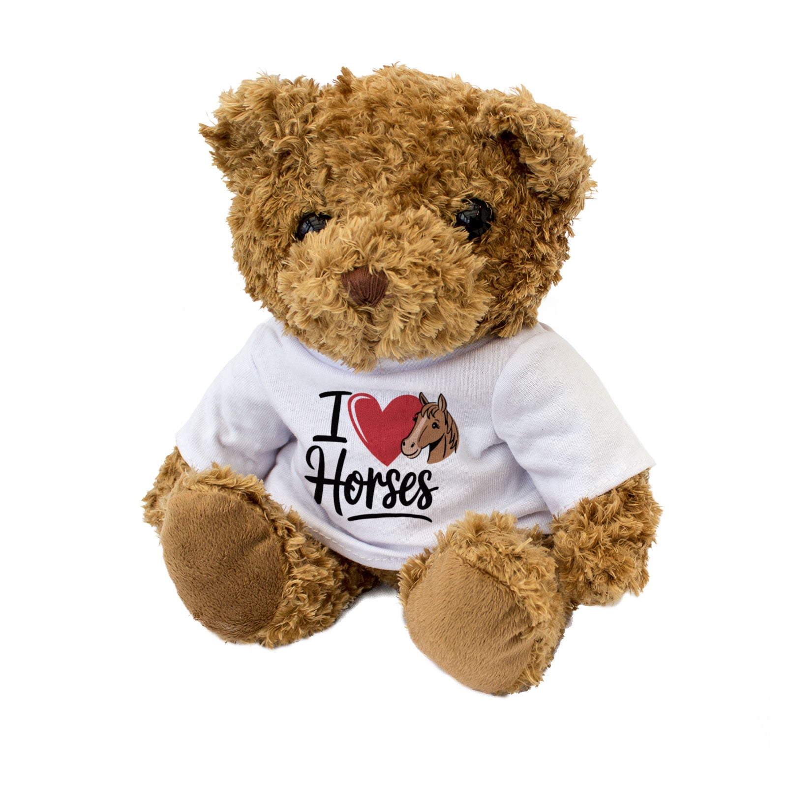 Our bear wears a white t-shirt with the I Love Horses printed on it in full colour. This teddy bear makes a thoughtful and personal gift for friends and family.