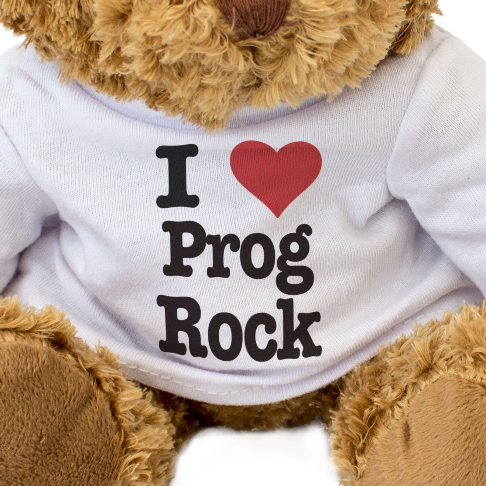 This teddy bear wears a white t-shirt with I Love Prog Rock printed on it.
