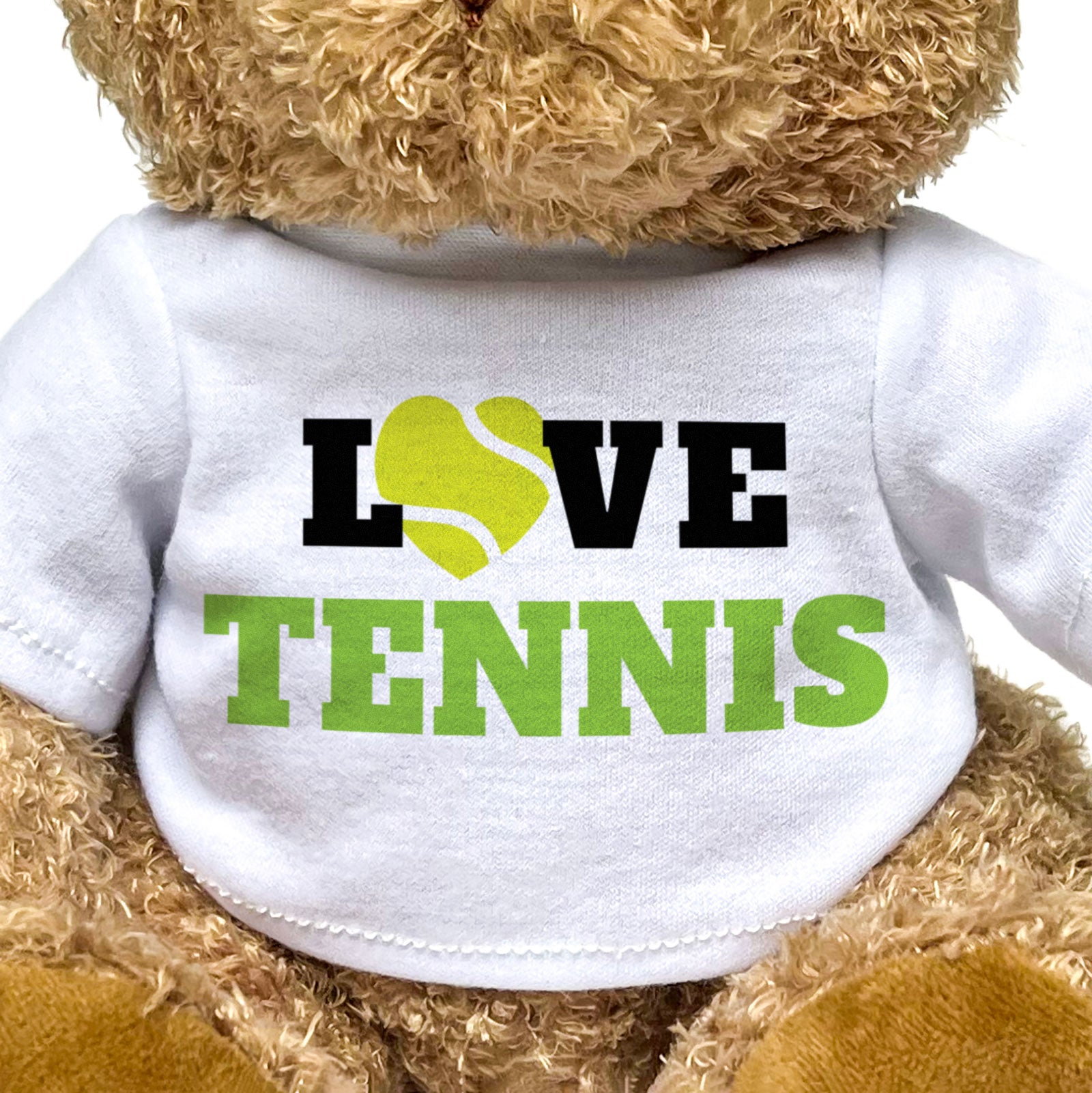 Our bear wears a white t-shirt with Love Tennis printed on it in full colour. This teddy bear makes a thoughtful and personal gift for friends and family.