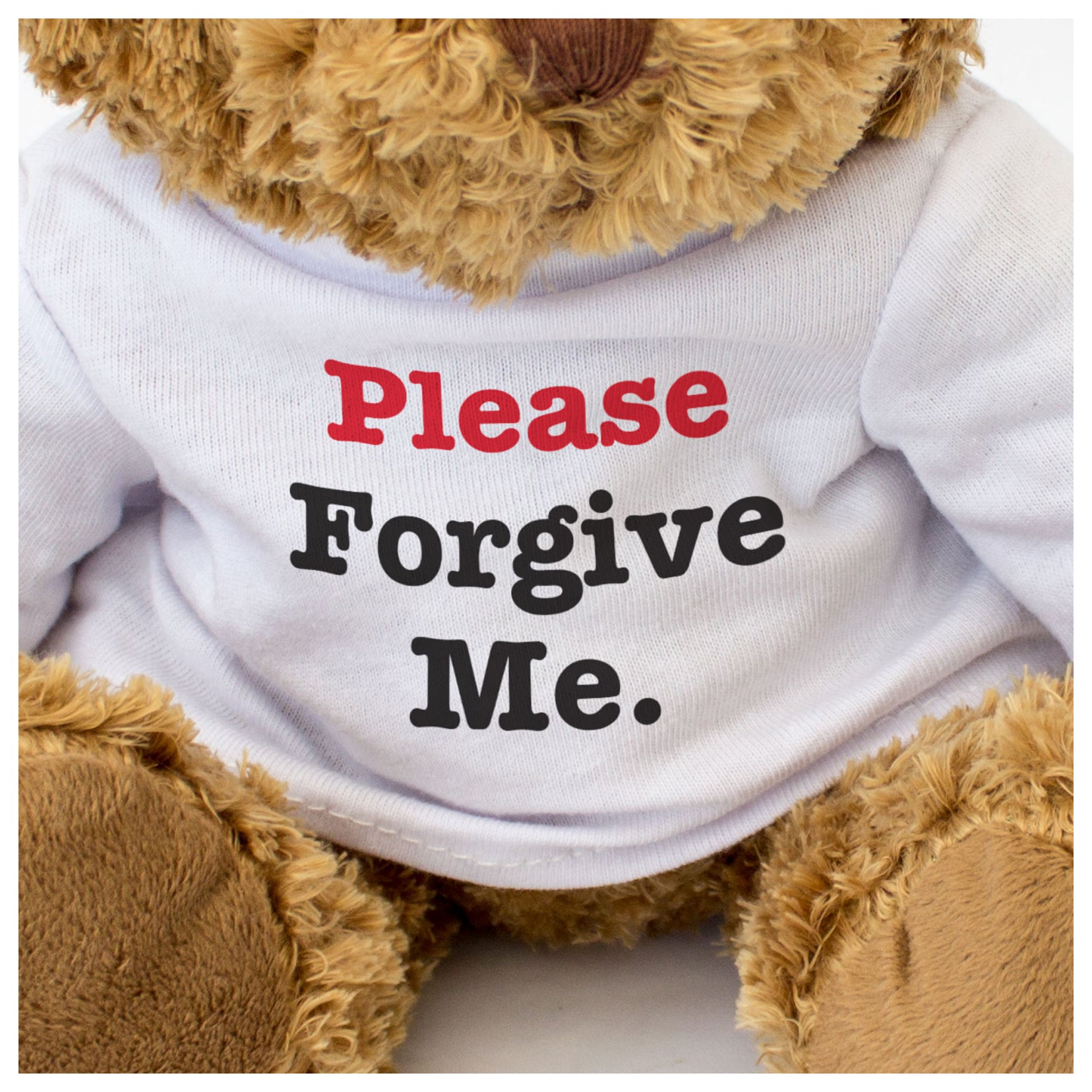This teddy bear wears a white t-shirt with Please Forgive Me printed on it.