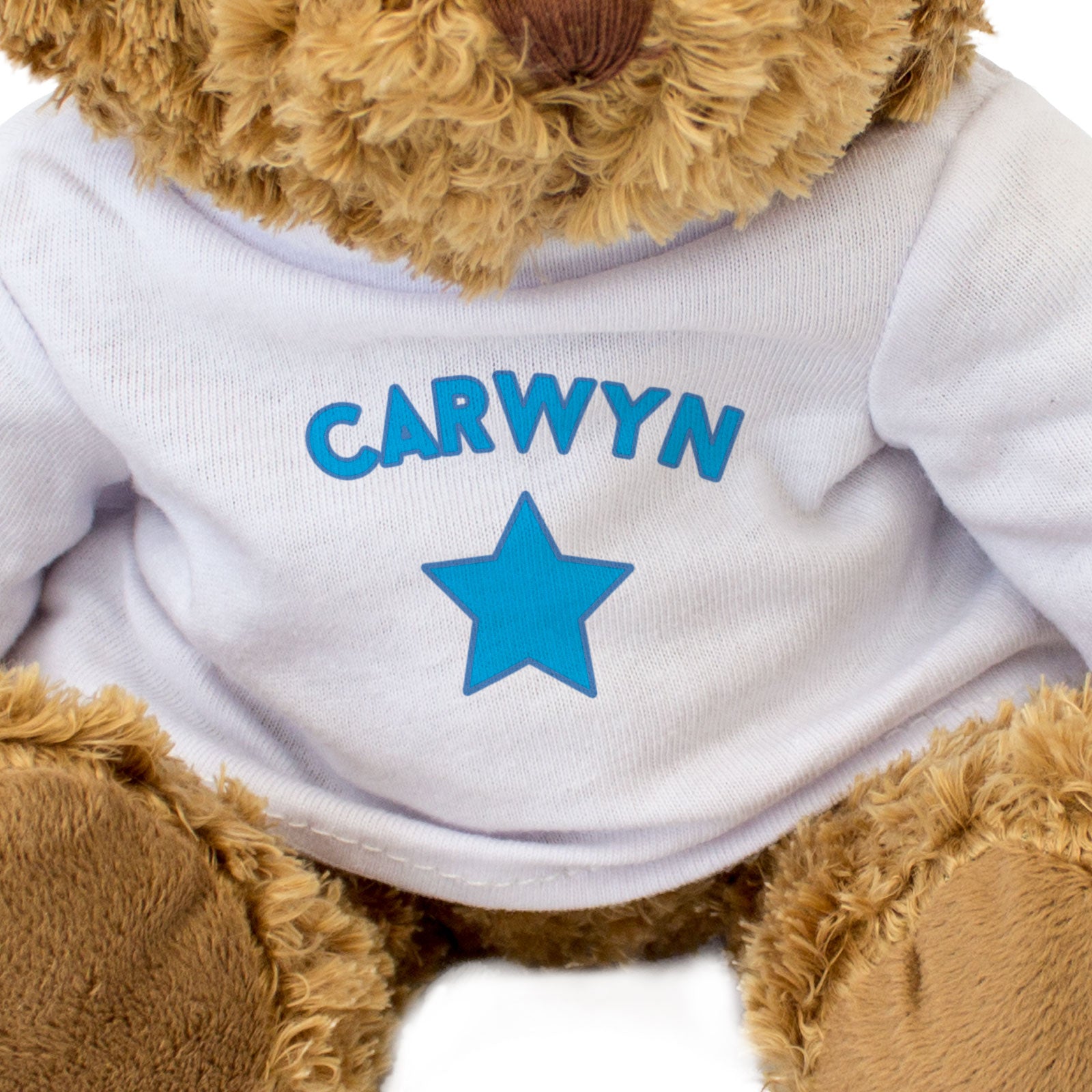 Our bear wears a white t-shirt with Carwyn printed on it in blue. This bear makes a thoughtful and personal gift for family members and friends