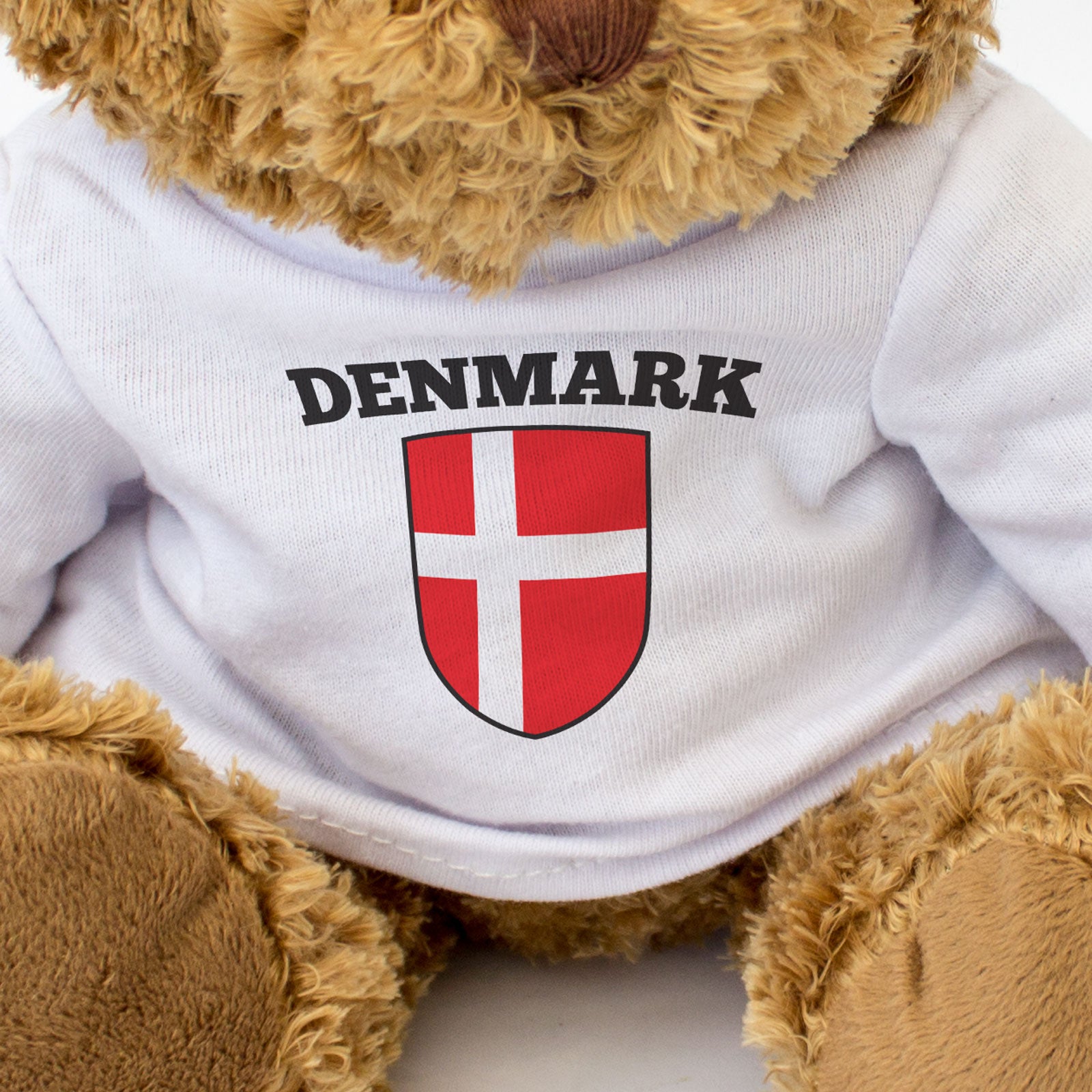 Our bear wears a white t-shirt with the Denmark Flag printed on it in full colour. This teddy bear makes a thoughtful and personal gift for friends and family.
