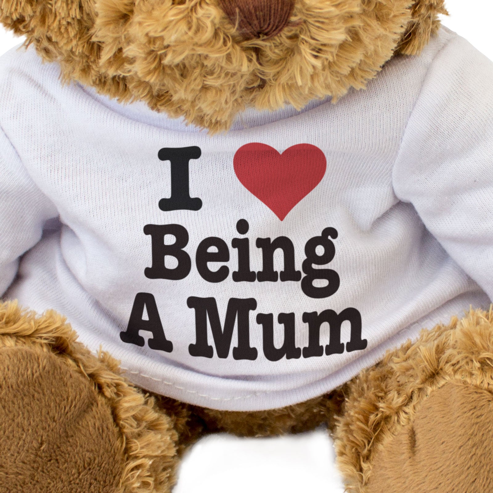 Our bear wears a white t-shirt with I LOVE BEING A MUM printed on it.