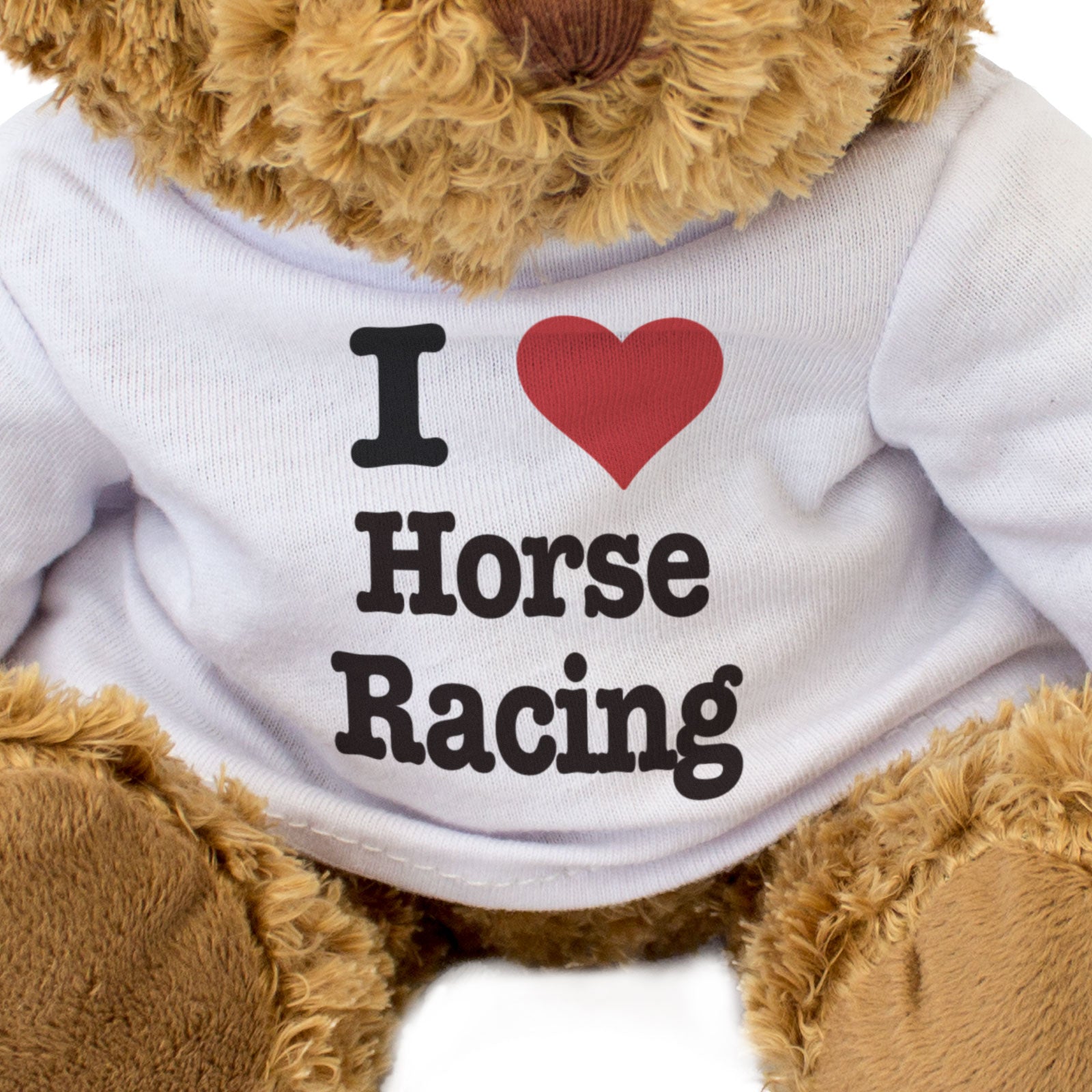 Our bear wears a white t-shirt with I Love Horse Racing printed on it in full colour. This teddy bear makes a thoughtful and personal gift for friends and family.