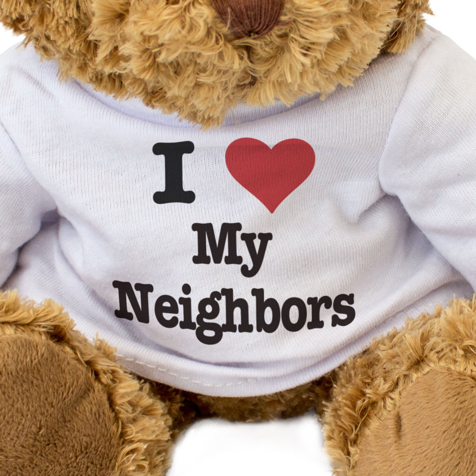 Our bear wears a white t-shirt with I Love My Neighbors printed on it in full colour. This teddy bear makes a thoughtful and personal gift for friends and family.