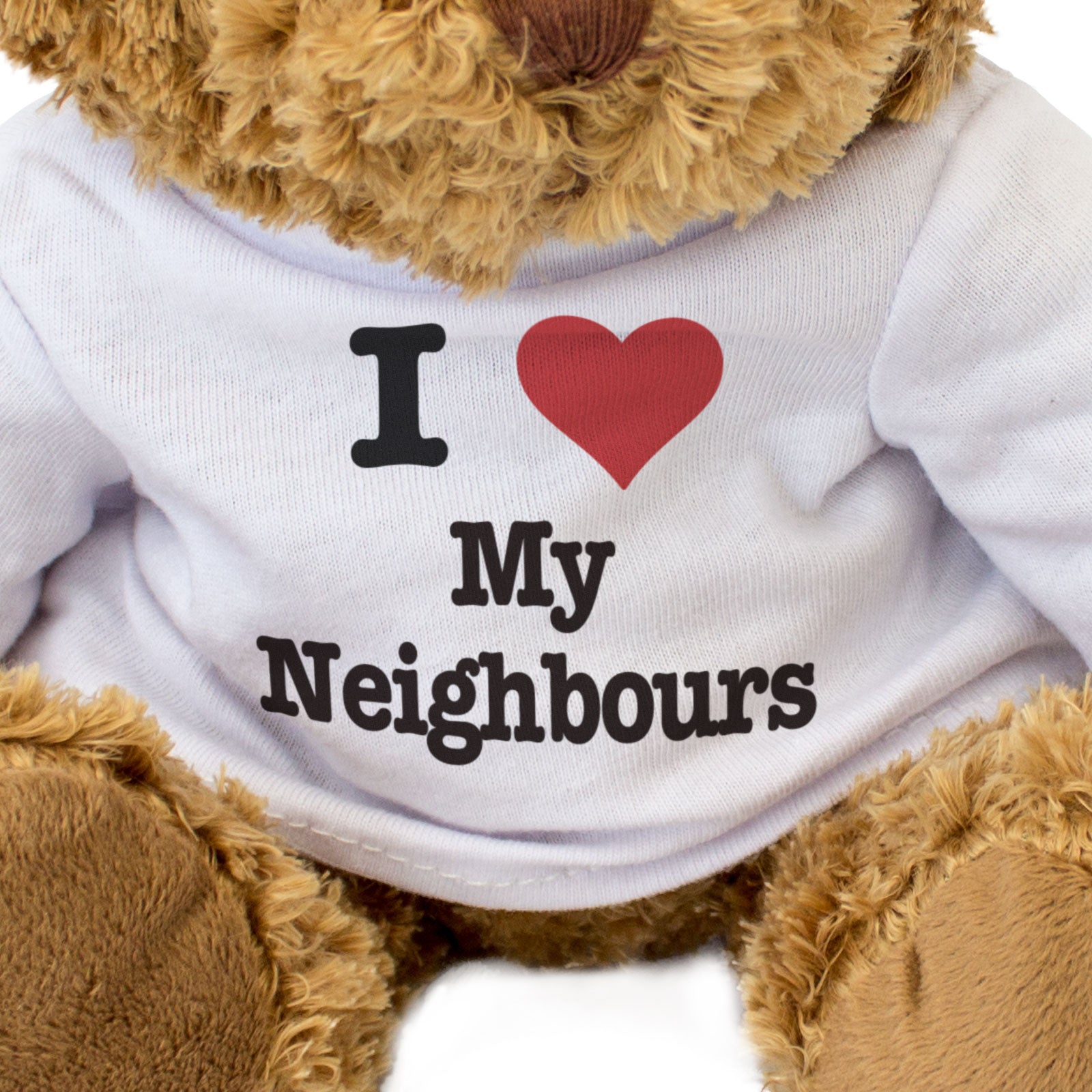 Our bear wears a white t-shirt with I Love My Neighbours printed on it in full colour. This teddy bear makes a thoughtful and personal gift for friends and family.