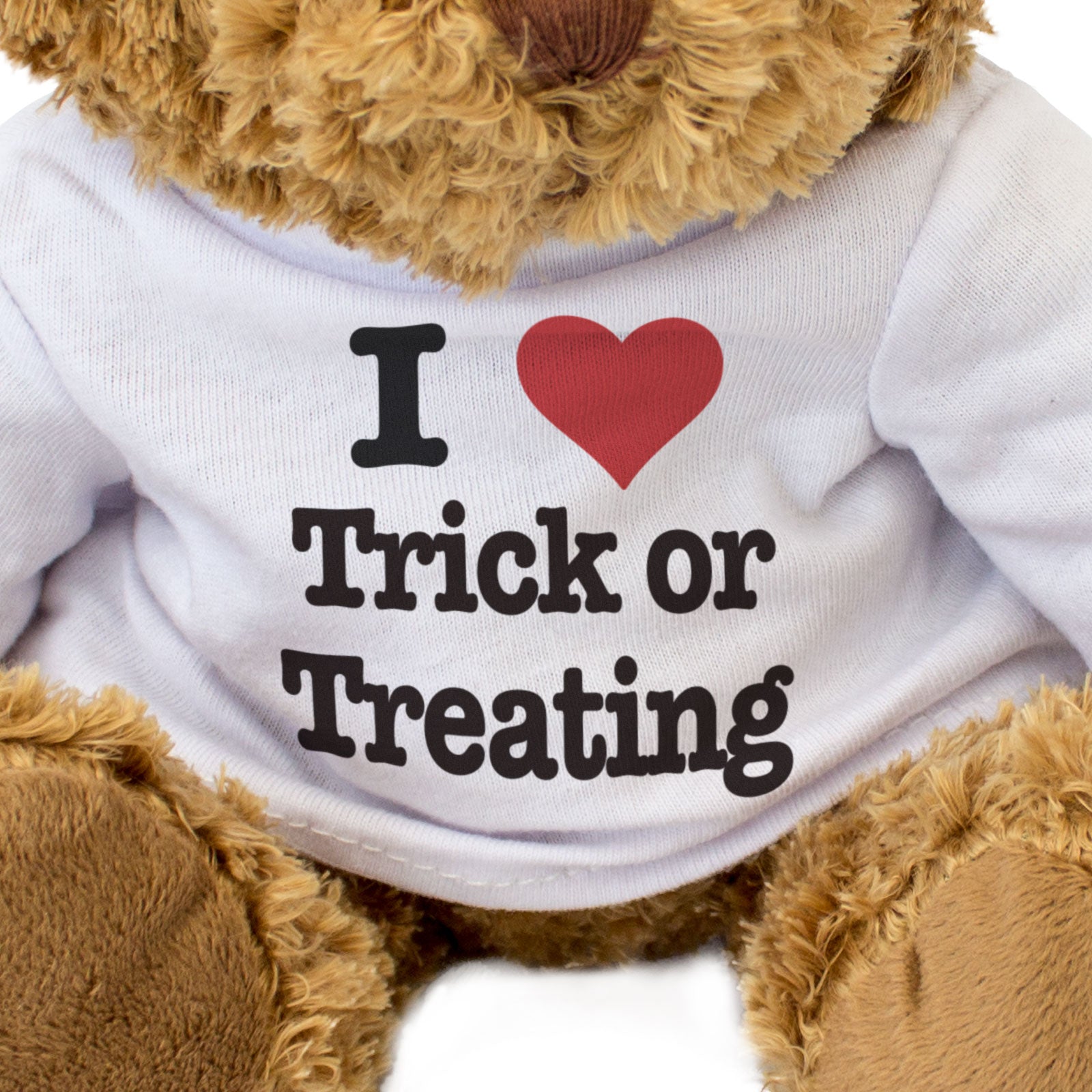 Our bear wears a white t-shirt with I Love Trick or Treating printed on it in full colour. This teddy bear makes a thoughtful and personal gift for friends and family.