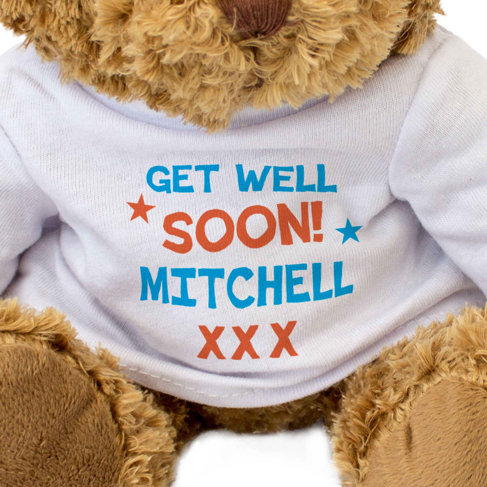 This teddy bear wears a white t-shirt with Get Well Soon Mitchell printed on it.