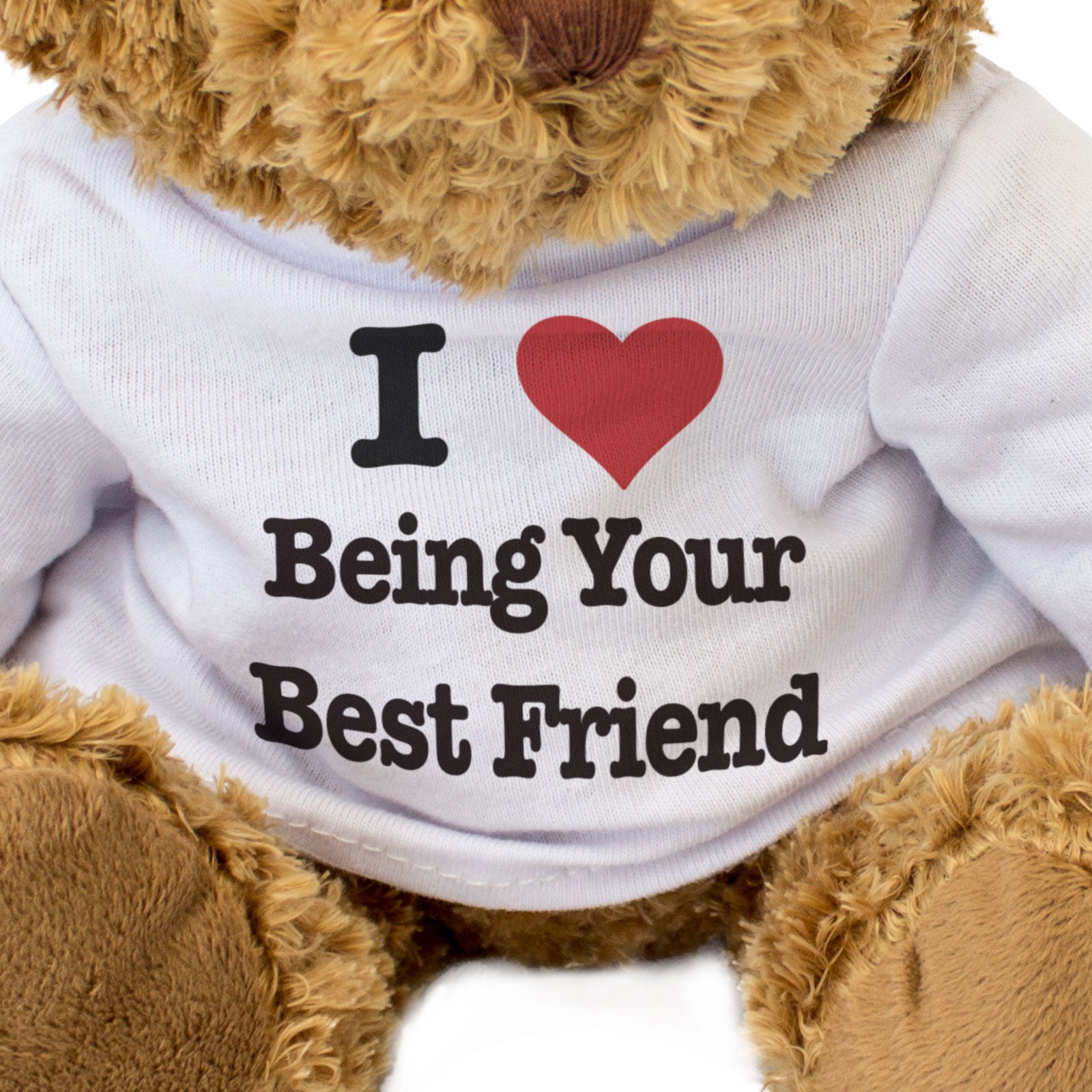 Our bear wears a white t-shirt with I Love Being Your Best Friend printed on it in full colour. This teddy bear makes a thoughtful and personal gift for friends and family.