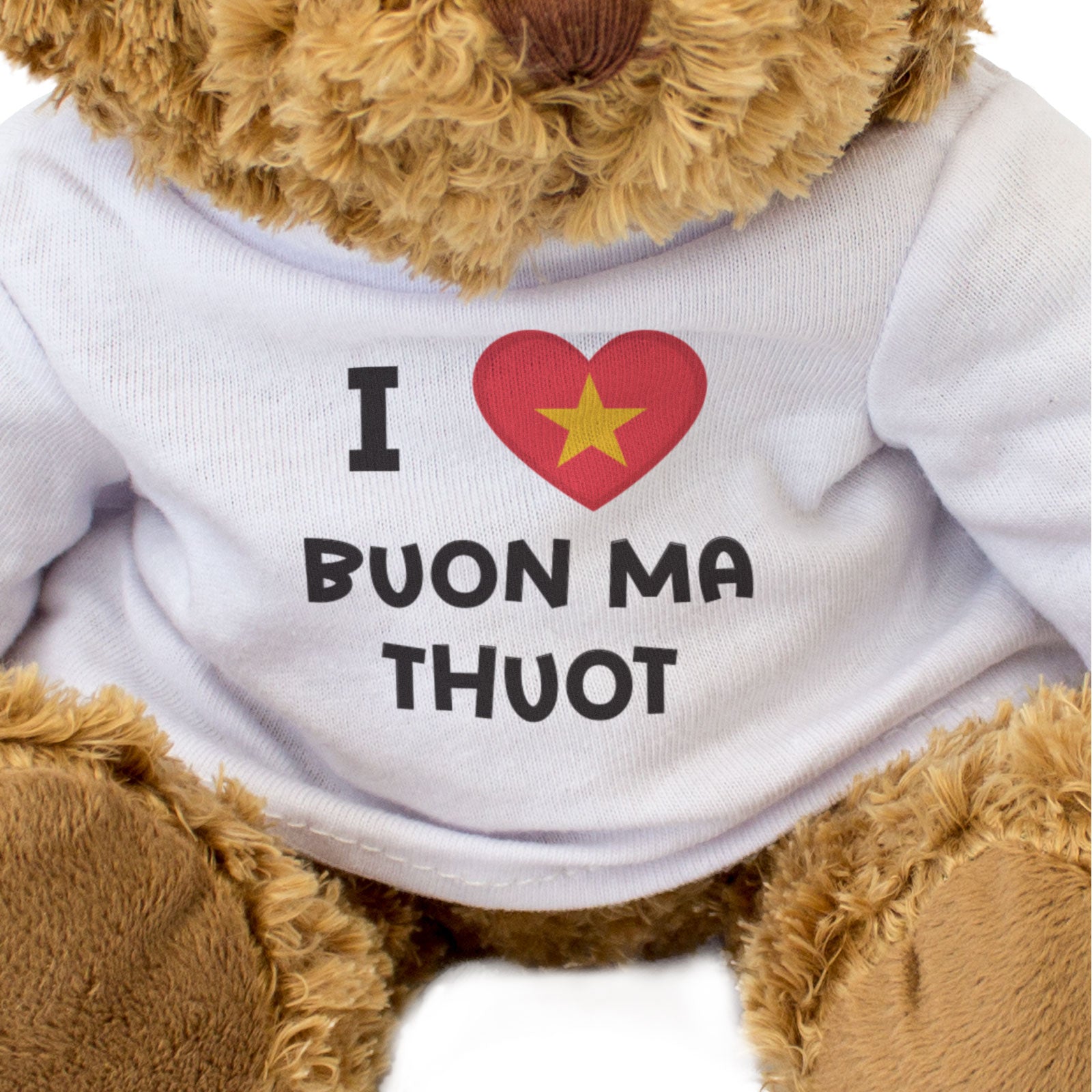 Our bear wears a white t-shirt with I Love Buon Ma Thuot printed on it in full colour. This teddy bear makes a thoughtful and personal gift for friends and family.