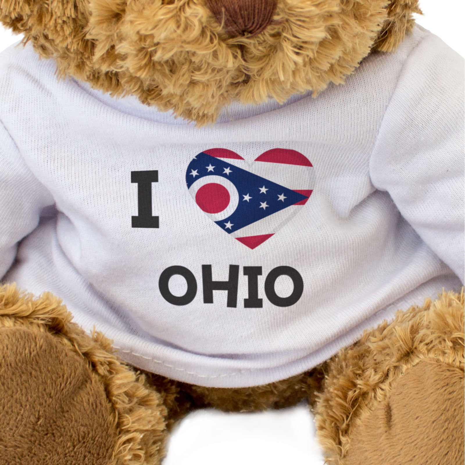 Our bear wears a white t-shirt with I Love Ohio printed on it in full colour. This teddy bear makes a thoughtful and personal gift for friends and family.