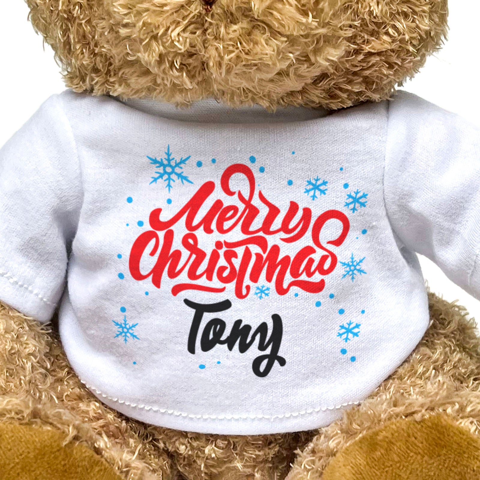Our bear wears a white t-shirt with Merry Christmas Tony printed on it in full colour. This teddy bear makes a thoughtful and personal gift for friends and family.