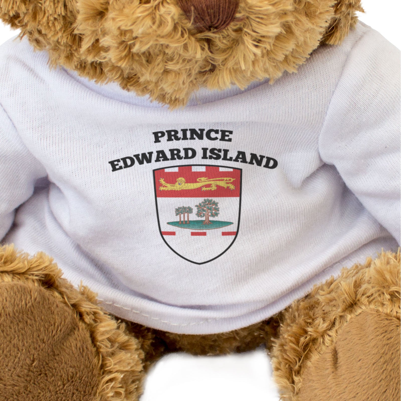 Our bear wears a white t-shirt with the flag of Prince Edward Island printed on it in full colour. This bear makes a thoughtful and personal gift for friends and family.