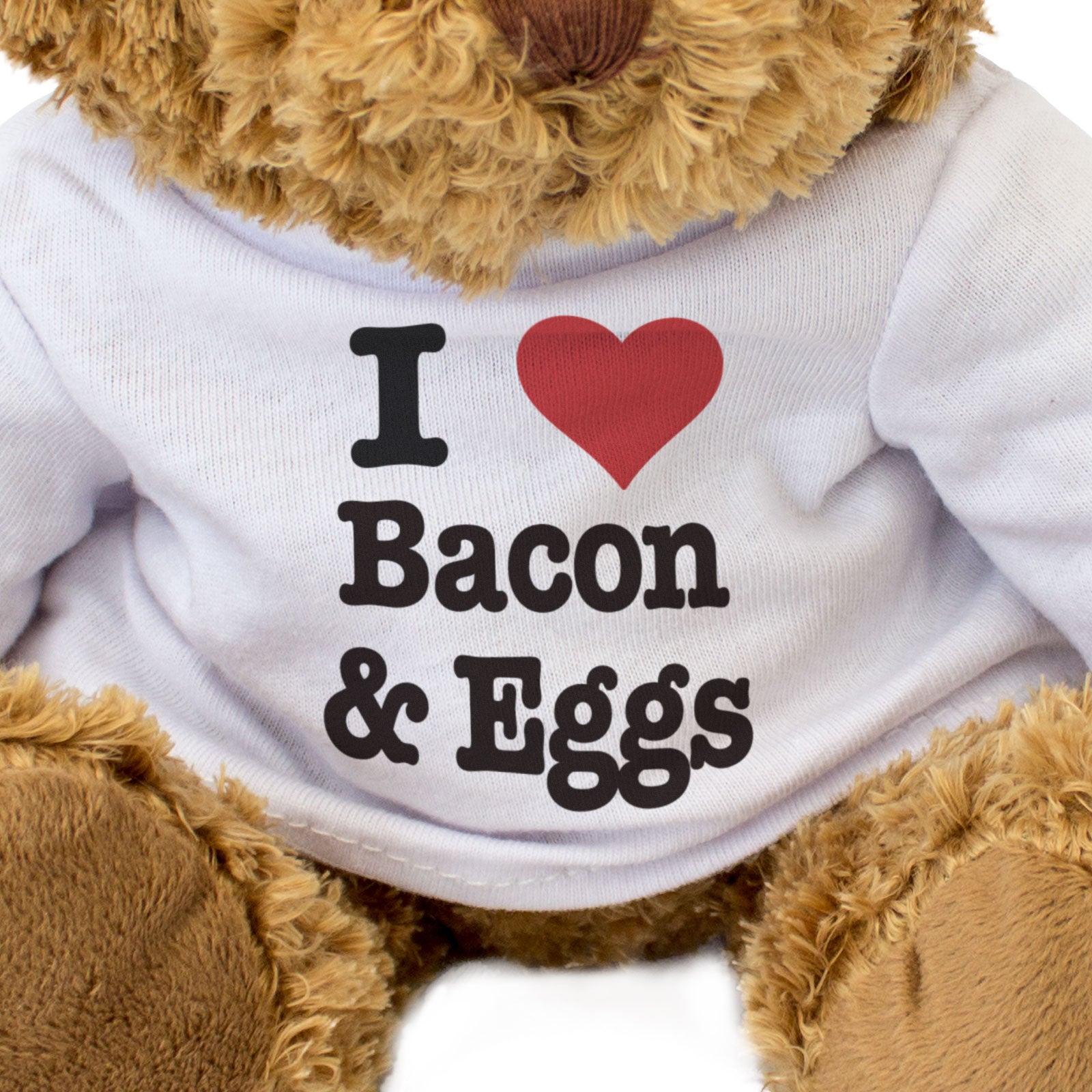 Our bear wears a white t-shirt with I Love Bacon & Eggs printed on it in full colour. This teddy bear makes a thoughtful and personal gift for friends and family.