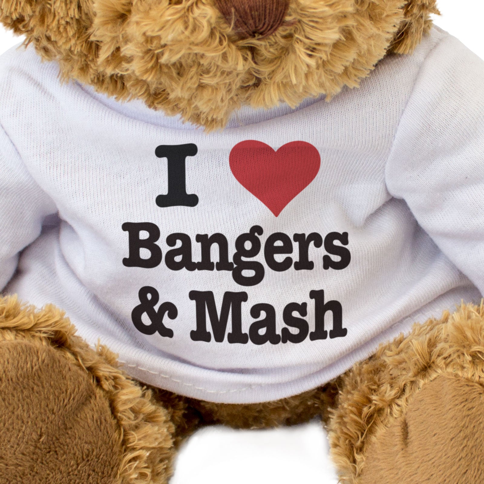 Our bear wears a white t-shirt with I Love Bangers & Mash printed on it in full colour. This teddy bear makes a thoughtful and personal gift for friends and family.