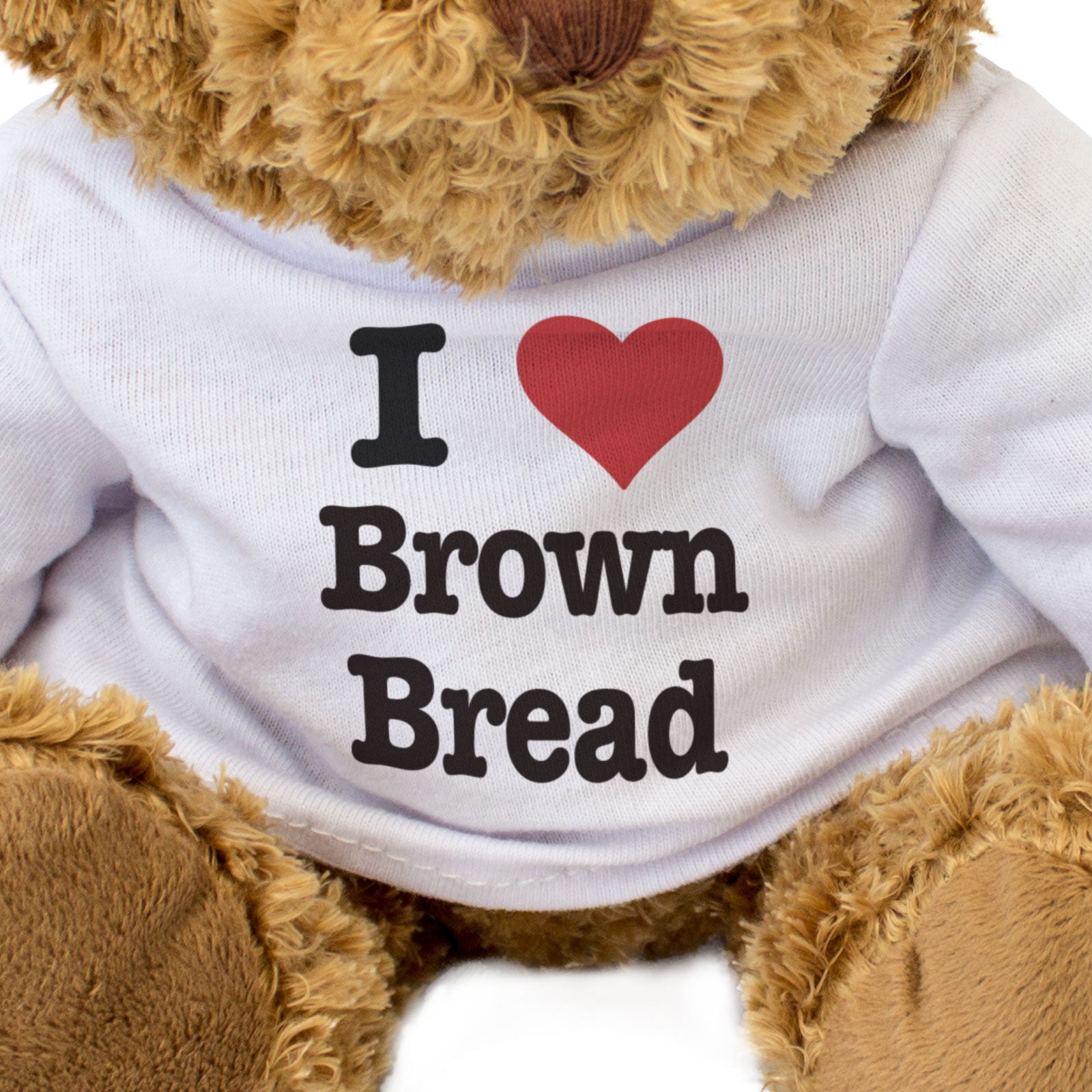 Our bear wears a white t-shirt with I Love Brown Bread printed on it in full colour. This teddy bear makes a thoughtful and personal gift for friends and family.