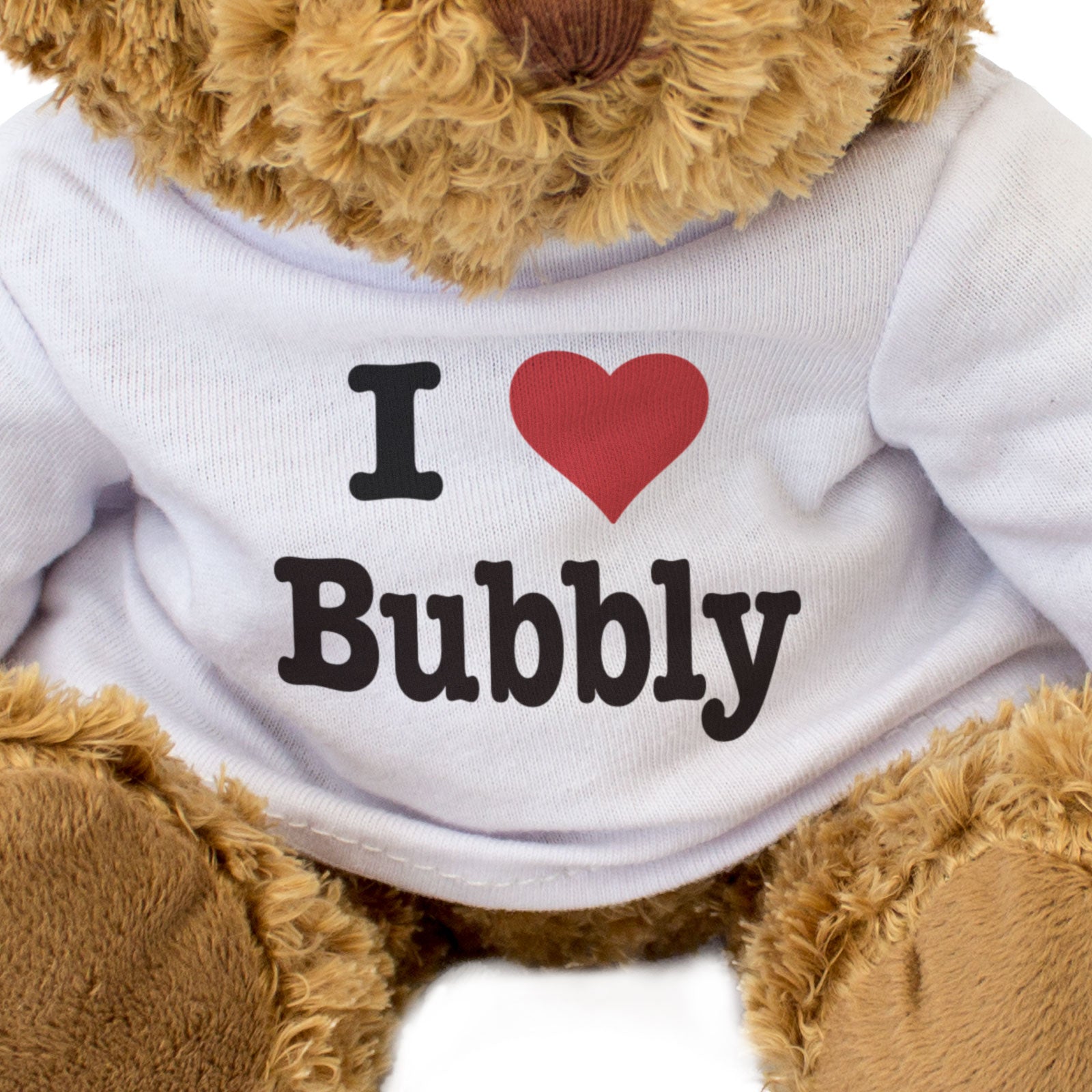 Our bear wears a white t-shirt with I Love Bubbly printed on it in full colour. This teddy bear makes a thoughtful and personal gift for friends and family.